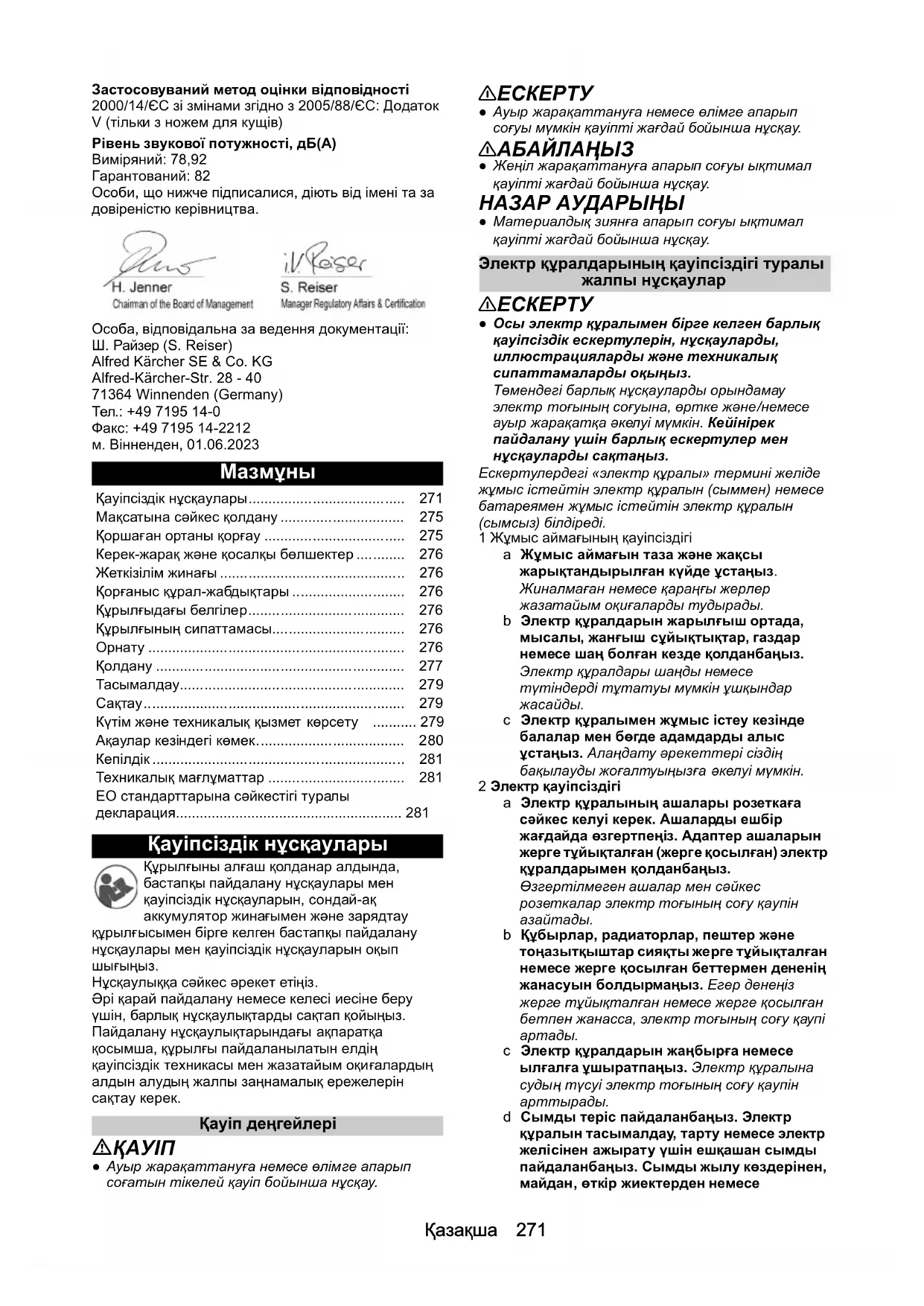 кепілдік берілген dB(A) 82 Өлшемдері мен салмағы Шөп кескішпен салмағы kg 0,58 Бұта кескішпен салмағы kg 0,63 Ұзындығы x ені x биіктігі (шөп кескішпен, аккумуляторсыз, пышақтың қорғаныс қабығынсыз) mm 306 x 83 x 132 Ұзындығы x ені x биіктігі (бұта кескішпен, аккумуляторсыз, пышақтың қорғаныс қабығынсыз) mm 392 x 81 x 132282 日本語 Қолданыстағы ЕО директивалары 2006/42/EG (+2009/127/EG)2014/30/EU2000/14/EG (+2005/88/EG)2011/65/EU Қолданылатын біріздендірілген стандарттар EN 55014-1: 2017 + A1: 2020EN 55014-2: 1997+A1: 2001+A2: 2008EN 62841-1:2015+A11EN 62841-4-2:2019+A1+A11EN 62841-4-5:2021+A11EN IEC 63000: 2018 Сəйкестікті бағалаудың қолданбалы əдісі 2000/14/EG жəне 2005/88/EG арқылы өзгертілді: V қосымшасы (бұта пышағымен ғана) Дыбыс қуаттылығының деңгейі дБ(А) Өлшенді: 78,92Кепілдік береді: 82 Қол қойғандар басқарманың тапсырмасы мен уəкілдігі бойынша əрекет етеді. Құжаттаманы жүргізетін уəкілетті тұлға: С. РайзерAlfred Kärcher SE & Co. KGAlfred-Kärcher-Str. 28 - 4071364 Winnenden (Германия)Тел.: +49 7195 14-0Телефакс: +49 7195 14-2212Винненден, 2023/06/01