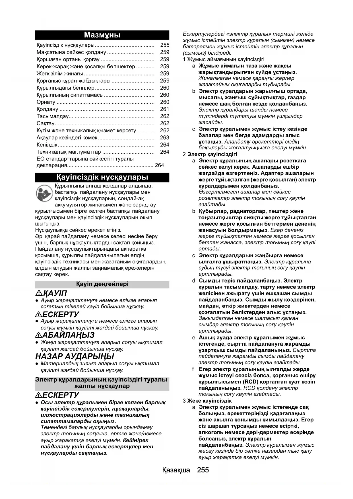 Жапсырмада көрсетілген дыбыс қысымының кепілді деңгейі 85 дБ құрайды.Қазақша 261