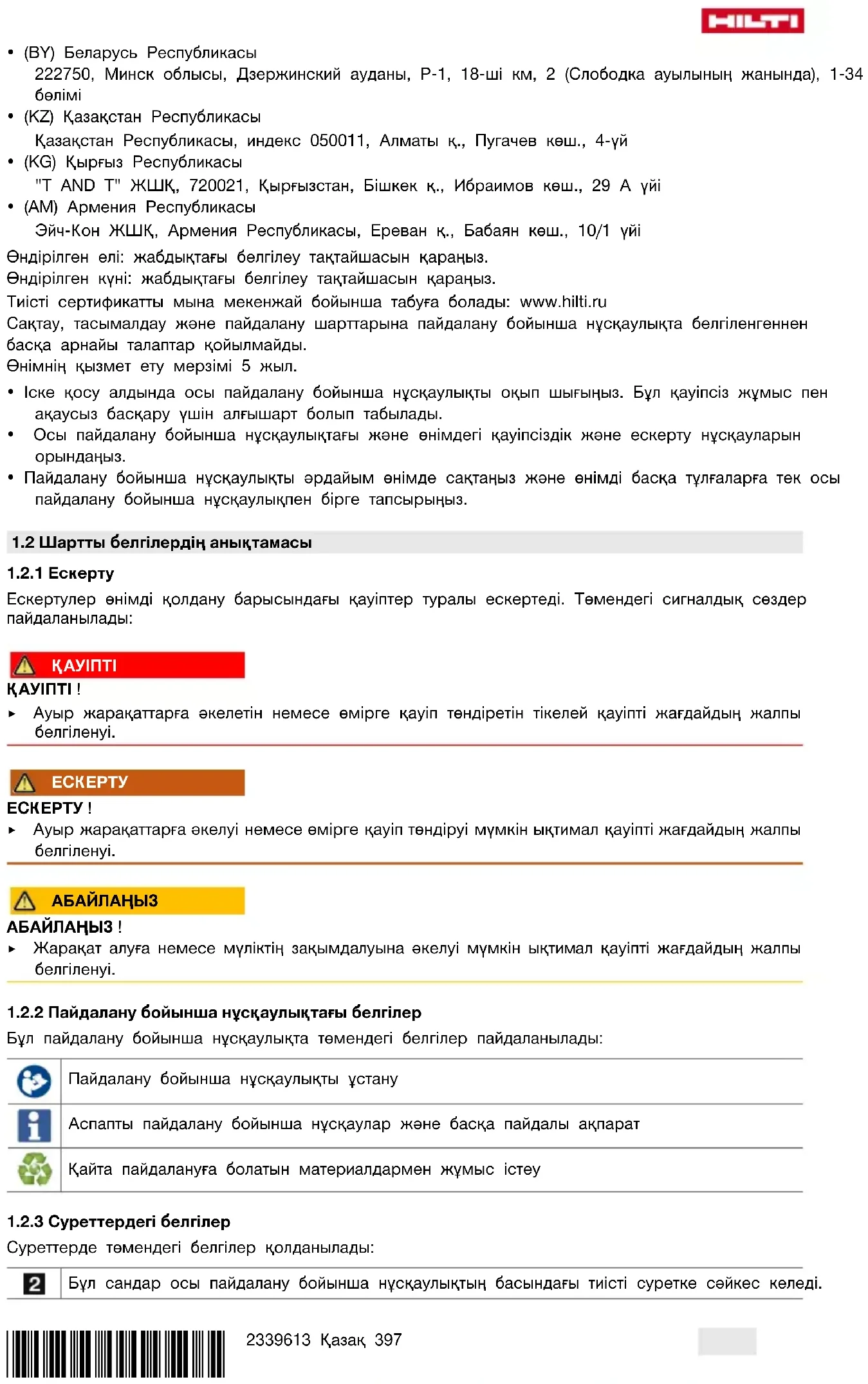 - (RU) Ресей Федерациясы "Хилти Дистрибьюшн ЛТД" АҚ, 141402, Мәскеу облысы, Химки қ., Ленинградская көш., ғим. 25*2339613* 2339613 Қазақ 397