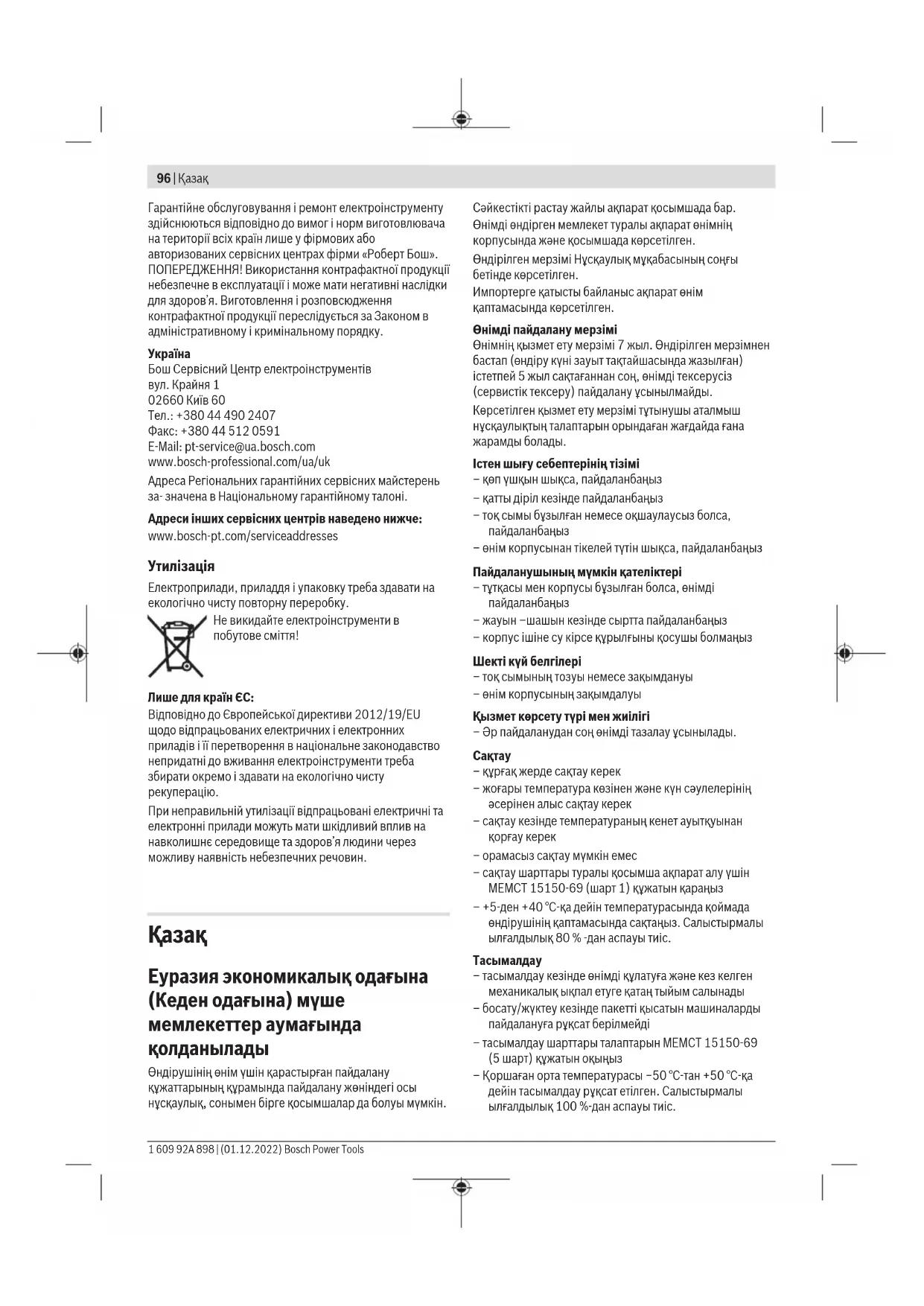 Сұрақтар қою және қосалқы бөлшектерге тапсырыс беру кезінде міндетті түрде өнімнің фирмалық тақтайшасындағы 10 таңбалы өнім нөмірін беріңіз. Өндіруші талаптары мен нормаларының сақталуымен электр құралын жөндеу және кепілді қызмет көрсету барлық мемлекеттер аумағында тек “Роберт Бош” фирмалық немесе авторизацияланған қызмет көрсету орталықтарында орындалады. ЕСКЕРТУ! Заңсыз жолмен әкелінген өнімдерді пайдалану қауіпті, денсаулығыңызға зиян келтіруі мүмкін. Өнімдерді заңсыз жасау және тарату әкімшілік және қылмыстық тәртіп бойынша Заңмен қудаланады.