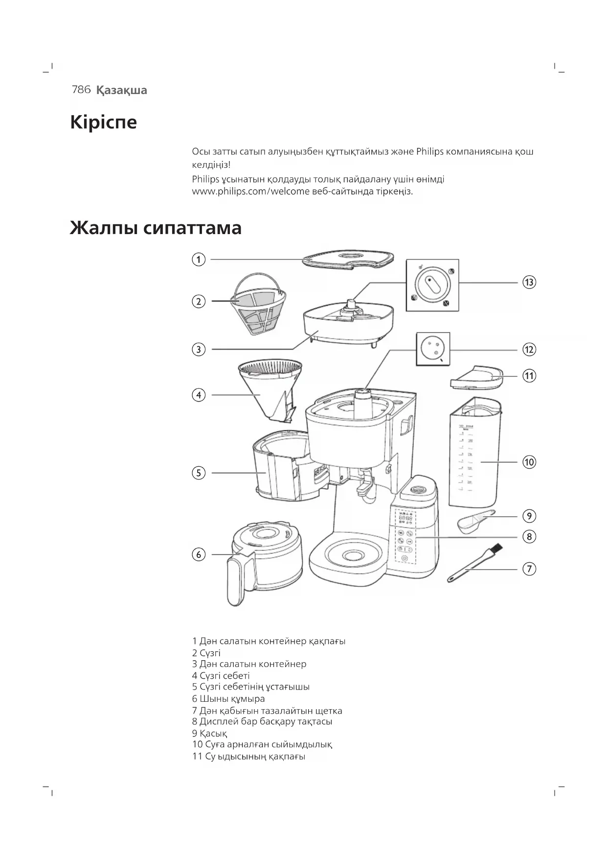 1 Дән салатын контейнер қақпағы 2 Сүзгі 3 Дән салатын контейнер 4 Сүзгі себеті 5 Сүзгі себетінің ұстағышы 6 Шыны құмыра 7 Дән қабығын тазалайтын щетка 8 Дисплей бар басқару тақтасы 9 Қасық 10 Суға арналған сыйымдылық 11 Су ыдысының қақпағы787