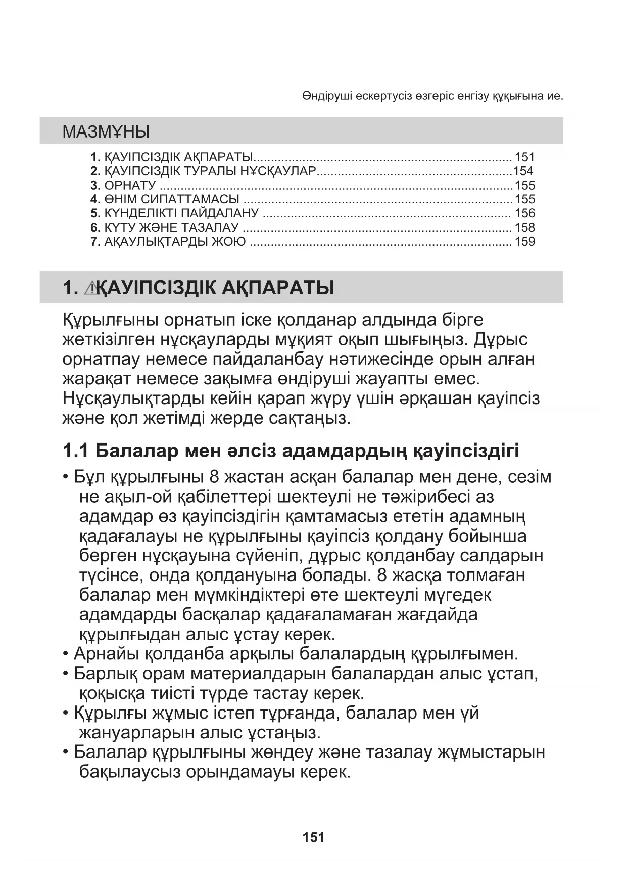 - Балалар құрылғыны жөндеу және тазалау жұмыстарын бақылаусыз орындамауы керек. 1511.2 Жалпы қауіпсіздік