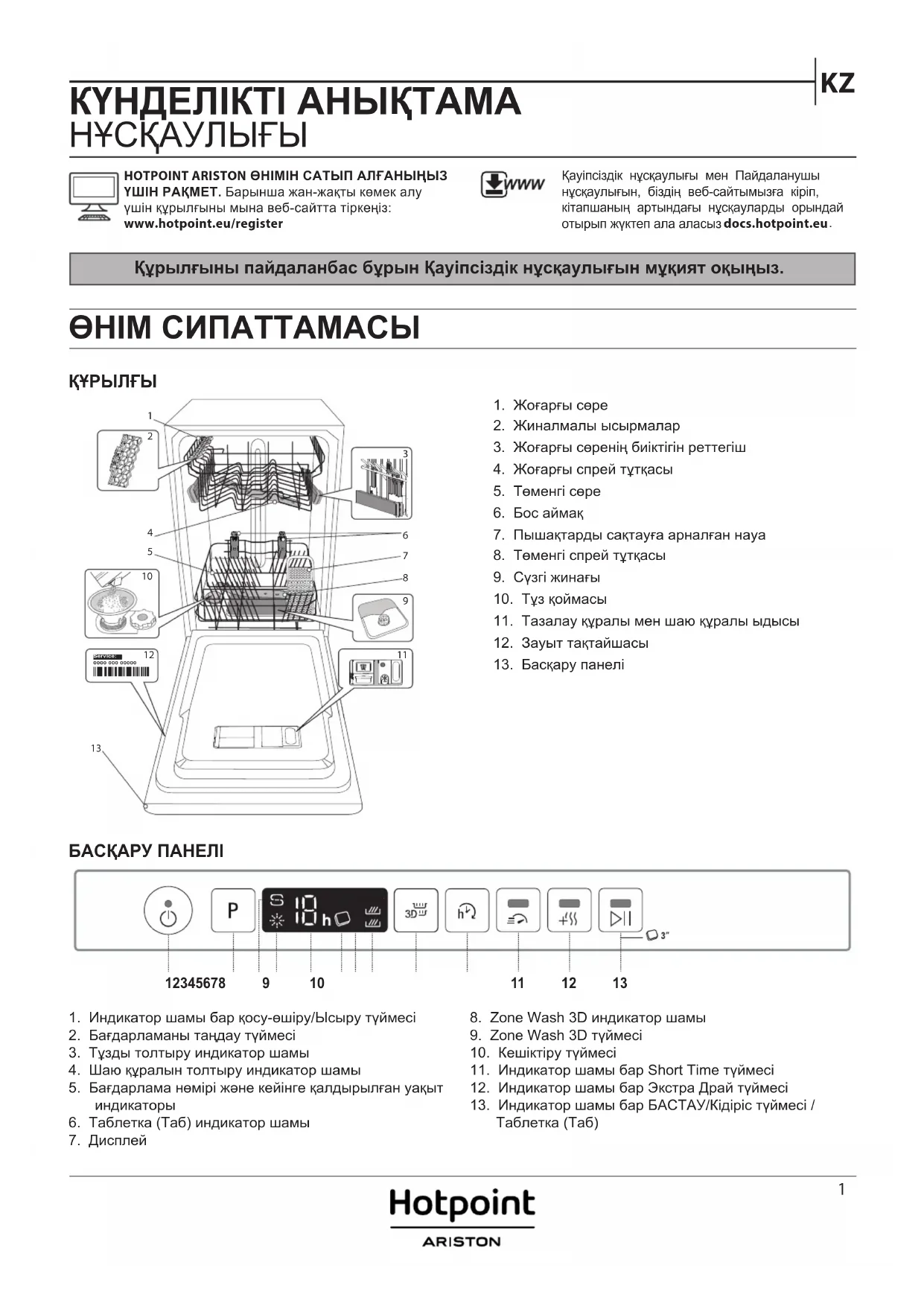 Құрылғыны пайдаланбас бұрын Қауіпсіздік нұсқаулығын мұқият оқыңыз. БАСҚАРУ ПАНЕЛІ 1. Индикатор шамы бар қосу-өшіру/Ысыру түймесі2. Бағдарламаны таңдау түймесі3. Тұзды толтыру индикатор шамы4. Шаю құралын толтыру индикатор шамы5. Бағдарлама нөмірі және кейінге қалдырылған уақыт индикаторы6. Таблетка (Таб) индикатор шамы7. Дисплей8. Zone Wash 3D индикатор шамы9. Zone Wash 3D түймесі10. Кешіктіру түймесі11. Индикатор шамы бар Short Time түймесі12. Индикатор шамы бар Экстра Драй түймесі13. Индикатор шамы бар БАСТАУ/Кідіріс түймесі / Таблетка (Таб)HOTPOINT ARISTON ӨНІМІН САТЫП АЛҒАНЫҢЫЗ ҮШІН РАҚМЕТ. Барынша жан-жақты көмек алу үшін құрылғыны мына веб-сайтта тіркеңіз: www.hotpoint.eu/registerҚауіпсіздік нұсқаулығы мен Пайдаланушы нұсқаулығын, біздің веб-сайтымызға кіріп, кітапшаның артындағы нұсқауларды орындай отырып жүктеп ала аласыз docs.hotpoint.eu 1 2 3 4 5 6 7 8 9 1011 12 131. Жоғарғы сөре2. Жиналмалы ысырмалар3. Жоғарғы сөренің биіктігін реттегіш4. Жоғарғы спрей тұтқасы5. Төменгі сөре6. Бос аймақ7. Пышақтарды сақтауға арналған науа8. Төменгі спрей тұтқасы9. Сүзгі жинағы10. Тұз қоймасы11. Тазалау құралы мен шаю құралы ыдысы12. Зауыт тақтайшасы13. Басқару панелі