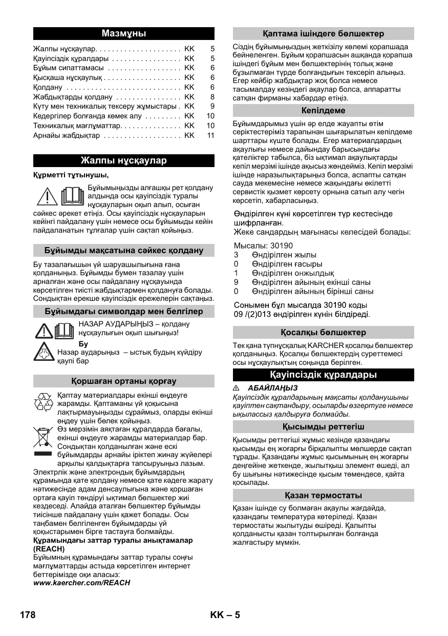 Қосалқы бөлшектер Тек қана түпнұсқалық KARCHER қосалқы бөлшектер қолданыңыз. Қосалқы бөлшектердің суреттемесі осы нұсқаулықтың соңында берілген. Қауіпсіздік құралдары Қоршаған ортаны қорғау Қаптау материалдары екінші өңдеуге жарамды. Қаптаманы үй қоқысына лақтырмауыңызды сұраймыз, оларды екінші өңдеу үшін бөлек қойыңыз. Өз мерзімін аяқтаған құралдарда бағалы, екінші өңдеуге жарамды материалдар бар. Сондықтан қолданылған жəне ескі бұйымдарды арнайы іріктеп жинау жүйелері арқылы қалдықтарға тапсыруыңыз лазым. Электрлік жəне электрондық бұйымдардың құрамында қате қолдану немесе қате кəдеге жарату нəтижесінде адам денсаулығына жəне қоршаған ортаға қауіп төндіруі ықтимал бөлшектер жиі кездеседі. Алайда аталған бөлшектер бұйымды тиісінше пайдалану үшін қажет болады. Осы таңбамен белгіленген бұйымдарды үй қоқыстарымен бірге тастауға болмайды. Құрамындағы заттар туралы анықтамалар (REACH) Бұйымның құрамындағы заттар туралы соңғы мағлұматтарды астыда көрсетілген интернет беттерімізде оқи аласыз: www.kaercher.com/REACH