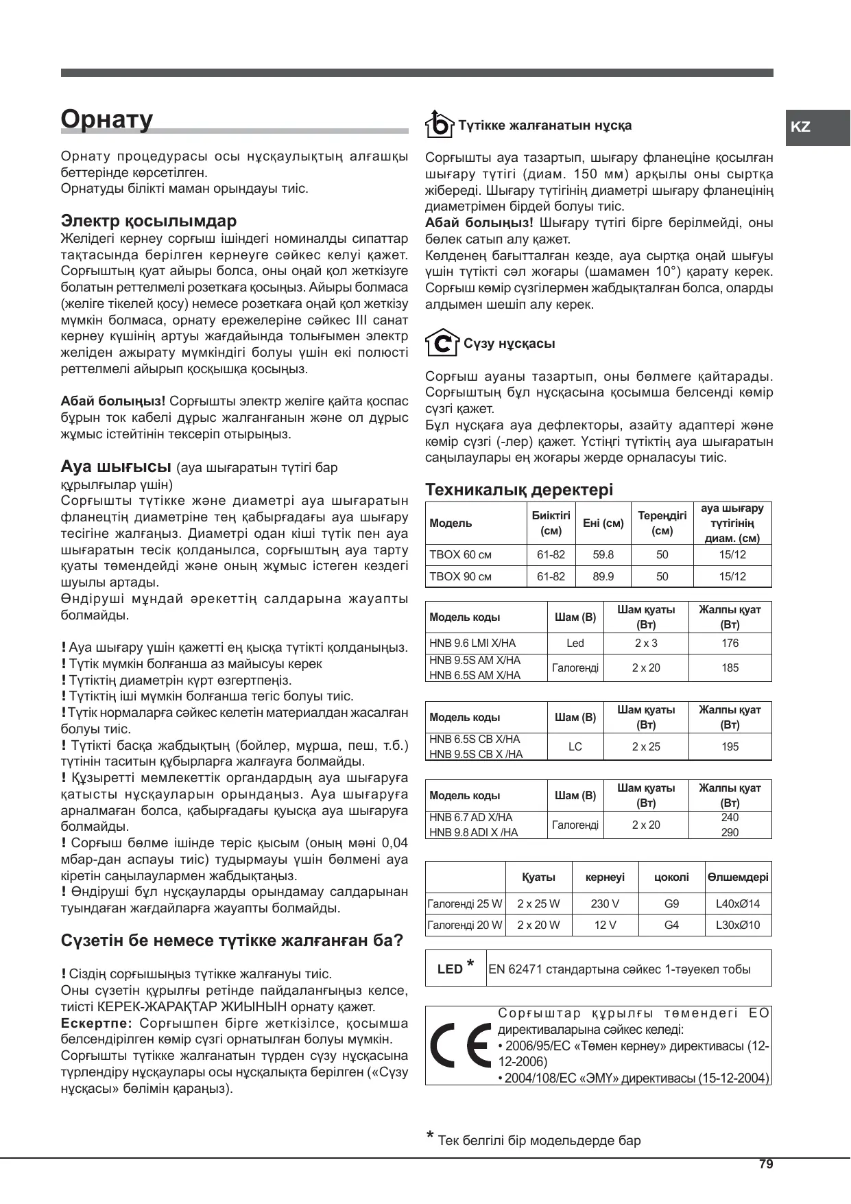 орнатыңыз). Шамдарды ауыстыру LED * С о р ғ ы ш т а д и од т ех н ол о г и я с ы н а н е г і зд ел ге н жарықтандыру жүйесі бар. Диодтар əдеттегі шамдарға қарағанда оңтайлы жарықтандыруды, ұзағырақ жұмыс істеуді жəне азырақ қуат пайдалануды қамтамасыз етеді. Оларды ауыстыру үшін көмек көрсету қызметіне хабарласыңыз. Электр кабелі Қуат кабелі зақымдалса, тəуекелдердің алдын алу үшін оны өндірушіге немесе оның техникалық қызметіне ауыстыртуға болады. ҚОҚЫСҚА ТАСТАУ Бұл құрылғы Қоқыс электр жəне электрондық жабдыққа (WEEE) қатысты EC/2012/19 Еуропалық директивасына сəйкес келеді деп белгіленген. Құрылғы қоқысқа дұрыс тасталуын қамтамасыз ету арқылы пайдаланушы қоршаған орта мен қоғамның денсаулығын қорғауға ат