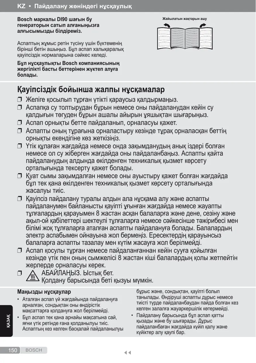 Аспаптың жұмыс ретін түсіну үшін бүктеменің бірінші бетін ашыңыз. Бұл аспап халықаралық қауіпсіздік нормаларына сәйкес келеді. Бұл нұсқаулықты Bosch компаниясының жергілікті басты беттерінен жүктеп алуға болады.