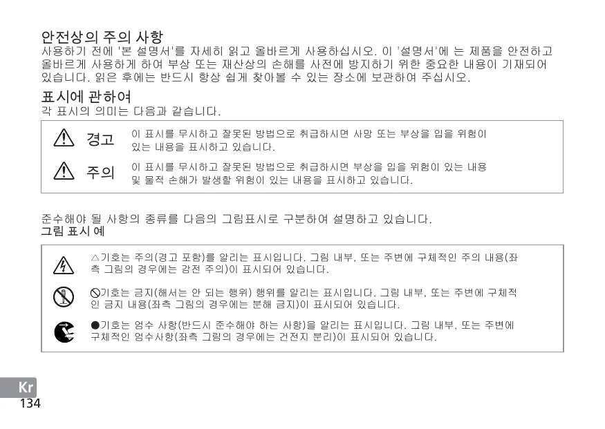 △기호는 주의(경고 포함)를 알리는 표시입니다. 그림 내부, 또는 주변에 구체적인 주의 내용(좌 측 그림의 경우에는 감전 주의)이 표시되어 있습니다. 기호는 금지(해서는 안 되는 행위) 행위를 알리는 표시입니다. 그림 내부, 또는 주변에 구체적 인 금지 내용(좌측 그림의 경우에는 분해 금지)이 표시되어 있습니다. ●기호는 엄수 사항(반드시 준수해야 하는 사항)을 알리는 표시입니다. 그림 내부, 또는 주변에 구체적인 엄수사항(좌측 그림의 경우에는 건전지 분리)이 표시되어 있습니다.