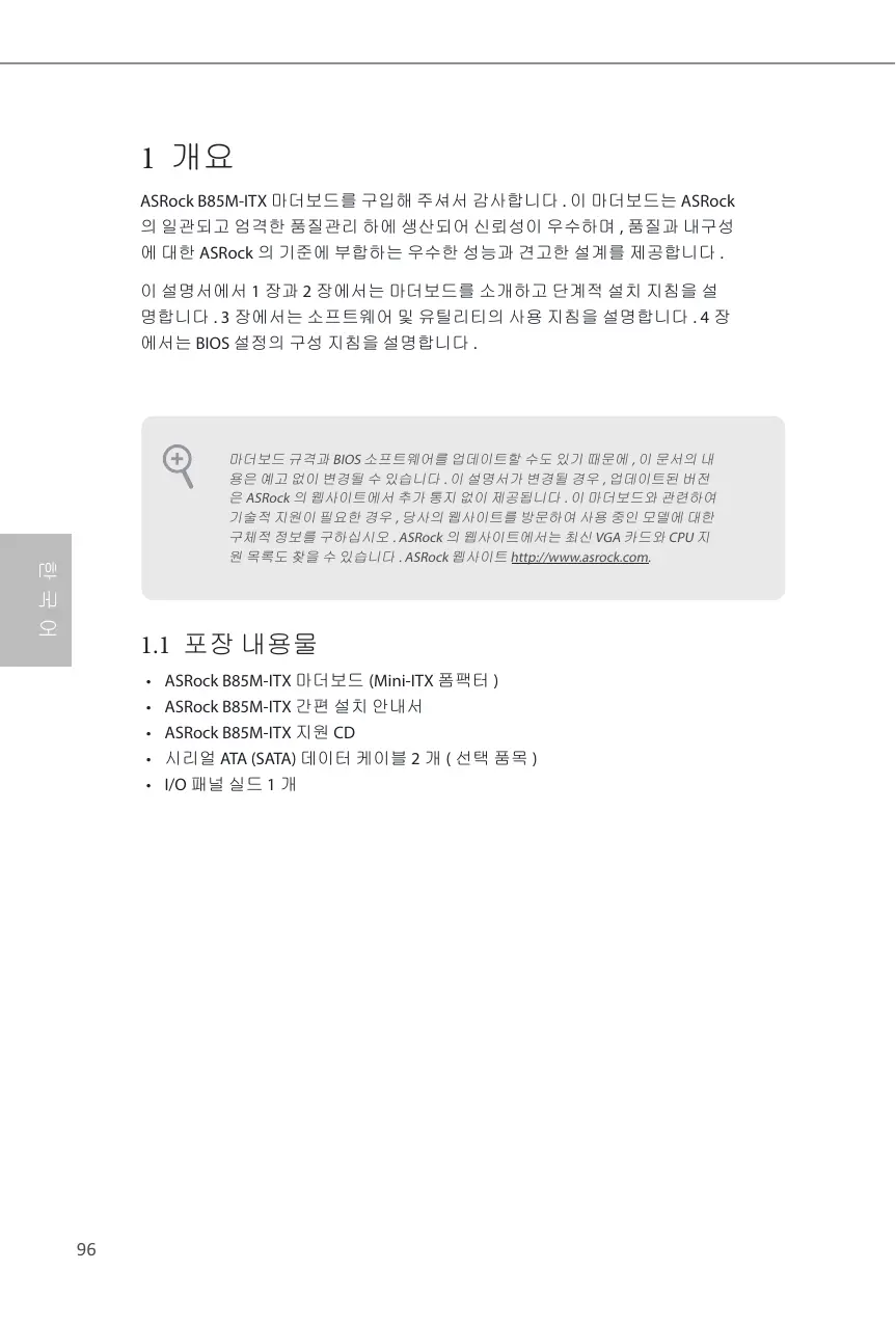 1 개요 ASRock B85M-ITX 마더보드를 구입해 주셔서 감사합니다 . 이 마더보드는 ASRock 의 일관되고 엄격한 품질관리 하에 생산되어 신뢰성이 우수하며 , 품질과 내구성 에 대한 ASRock 의 기준에 부합하는 우수한 성능과 견고한 설계를 제공합니다 . 이 설명서에서 1 장과 2 장에서는 마더보드를 소개하고 단계적 설치 지침을 설 명합니다 . 3 장에서는 소프트웨어 및 유틸리티의 사용 지침을 설명합니다 . 4 장 에서는 BIOS 설정의 구성 지침을 설명합니다 .