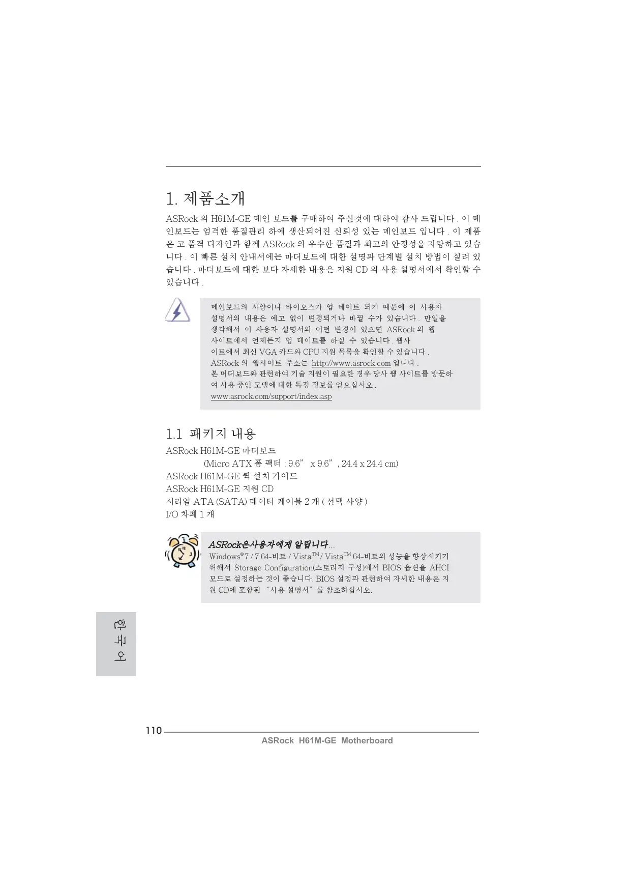 ASRock 의 H61M-GE 메인 보드를 구매하여 주신것에 대하여 감사 드립니다 . 이 메 인보드는 엄격한 품질관리 하에 생산되어진 신뢰성 있는 메인보드 입니다 . 이 제품 은 고 품격 디자인과 함께 ASRock 의 우수한 품질과 최고의 안정성을 자랑하고 있습 니다 . 이 빠른 설치 안내서에는 마더보드에 대한 설명과 단계별 설치 방법이 실려 있 습니다 . 마더보드에 대한 보다 자세한 내용은 지원 CD 의 사용 설명서에서 확인할 수 메인보드의 사양이나 바이오스가 업 데이트 되기 때문에 이 사용자 설명서의 내용은 예고 없이 변경되거나 바뀔 수가 있습니다 . 만일을 생각해서 이 사용자 설명서의 어떤 변경이 있으면 ASRock 의 웹 사이트에서 언제든지 업 데이트를 하실 수 있습니다 . 웹사 이트에서 최신 VGA 카드와 CPU 지원 목록을 확인할 수 있습니다 . ASRock 의 웹사이트 주소는 http://www.asrock.com 입니다 . 본 머더보드와 관련하여 기술 지원이 필요한 경우 당사 웹 사이트를 방문하 여 사용 중인 모델에 대한 특정 정보를 얻으십시오 . www.asrock.com/support/index.asp