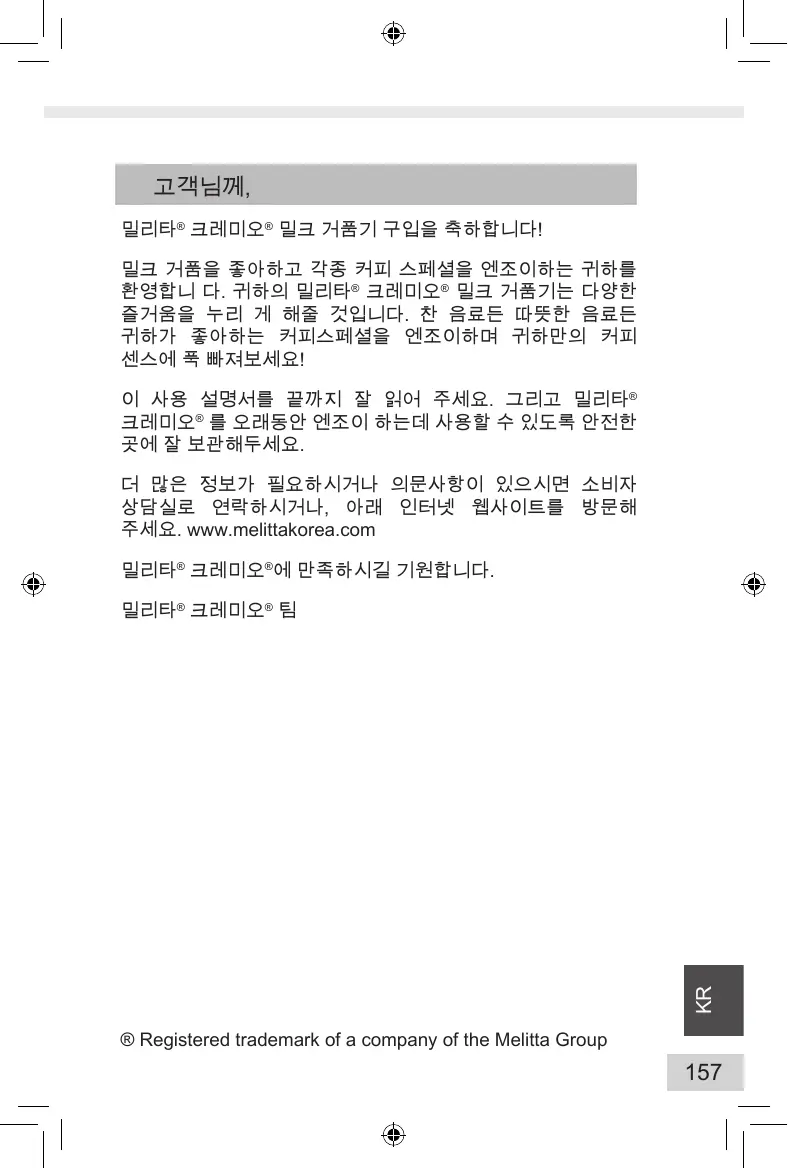 고객님께, 밀리타® 크레미오® 밀크 거품기 구입을 축하합니다! 밀크 거품을 좋아하고 각종 커피 스페셜을 엔조이하는 귀하를 환영합니 다. 귀하의 밀리타® 크레미오® 밀크 거품기는 다양한 즐거움을 누리 게 해줄 것입니다. 찬 음료든 따뜻한 음료든 귀하가 좋아하는 커피스페셜을 엔조이하며 귀하만의 커피 센스에 푹 빠져보세요! 이 사용 설명서를 끝까지 잘 읽어 주세요. 그리고 밀리타® 크레미오® 를 오래동안 엔조이 하는데 사용할 수 있도록 안전한 곳에 잘 보관해두세요. 더 많은 정보가 필요하시거나 의문사항이 있으시면 소비자 상담실로 연락하시거나, 아래 인터넷 웹사이트를 방문해 주세요. www.melittakorea.com 밀리타® 크레미오®에 만족하시길 기원합니다.
