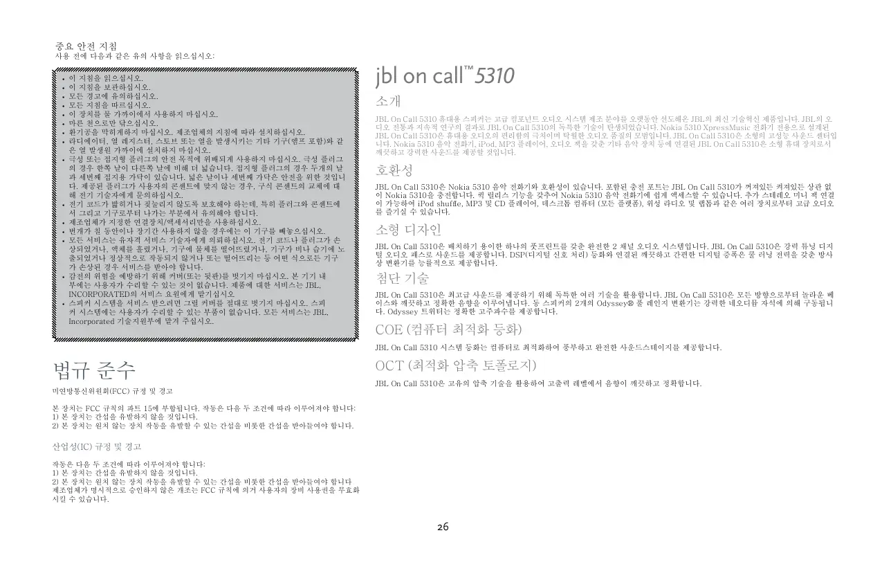 이 지침을 읽으십시오. 이 지침을 보관하십시오. 모든 경고에 유의하십시오. 모든 지침을 따르십시오. 이 장치를 물 가까이에서 사용하지 마십시오. 마른 천으로만 닦으십시오. 환기공을 막히게하지 마십시오. 제조업체의 지침에 따라 설치하십시오. 라디에이터, 열 레지스터, 스토브 또는 열을 발생시키는 기타 기구(앰프 포함)와 같 은 열 발생원 가까이에 설치하지 마십시오. 극성 또는 접지형 플러그의 안전 목적에 위배되게 사용하지 마십시오. 극성 플러그 의 경우 한쪽 날이 다른쪽 날에 비해 더 넓습니다. 접지형 플러그의 경우 두개의 날 과 세번째 접지용 가닥이 있습니다. 넓은 날이나 세번째 가닥은 안전을 위한 것입니 다. 제공된 플러그가 사용자의 콘센트에 맞지 않는 경우, 구식 콘센트의 교체에 대 해 전기 기술자에게 문의하십시오. 전기 코드가 밟히거나 짖눌리지 않도록 보호해야 하는데, 특히 플러그와 콘센트에 서 그리고 기구로부터 나가는 부분에서 유의해야 합니다. 제조업체가 지정한 연결장치/액세서리만을 사용하십시오. 번개가 칠 동안이나 장기간 사용하지 않을 경우에는 이 기구를 빼놓으십시오. 모든 서비스는 유자격 서비스 기술자에게 의뢰하십시오. 전기 코드나 플러그가 손 상되었거나, 액체를 흘렸거나, 기구에 물체를 떨어뜨렸거나, 기구가 비나 습기에 노 출되었거나 정상적으로 작동되지 않거나 또는 떨어뜨리는 등 어떤 식으로든 기구 가 손상된 경우 서비스를 받아야 합니다. 감전의 위험을 예방하기 위해 커버(또는 뒷판)를 벗기지 마십시오. 본 기기 내 부에는 사용자가 수리할 수 있는 것이 없습니다. 제품에 대한 서비스는 JBL, INCORPORATED의 서비스 요원에게 맡기십시오 스피커 시스템을 서비스 받으려면 그릴 커버를 절대로 벗기지 마십시오. 스피 커 시스템에는 사용자가 수리할 수 있는 부품이 없습니다. 모든 서비스는 JBL, Incorporated 기술지원부에 맡겨 주십시오. jbl on call™5310 JBL On Call 5310 휴대용 스피커는 고급 컴포넌트 오디오 시스템 제조 분야를 오랫동안 선도해온 JBL의 최신 기술혁신 제품입니다. JBL의 오 디오 전통과 지속적 연구의 결과로 JBL On Call 5310의 독특한 기술이 탄생되었습니다. Nokia 5310 XpressMusic 전화기 전용으로 설계된 JBL On Call 5310은 휴대용 오디오의 편리함의 극치이며 탁월한 오디오 품질의 모범입니다. JBL On Call 5310은 소형의 고성능 사운드 센터입 니다. Nokia 5310 음악 전화기, iPod, MP3 플레이어, 오디오 잭을 갖춘 기타 음악 장치 등에 연결된 JBL On Call 5310은 소형 휴대 장치로서 깨끗하고 강력한 사운드를 제공할 것입니다.
