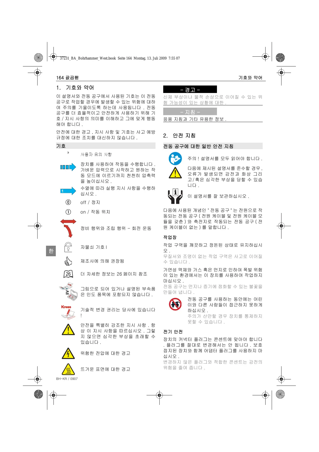 제조사에 의해 권장됨 더 자세한 정보는 26 페이지 참조 그림으로 되어 있거나 설명된 부속품 은 인도 품목에 포함되지 않습니다 . 작업 구역을 깨끗하고 정돈된 상태로 유지하십시 무질서와 조명이 없는 작업 구역은 사고로 이어질 가연성 액체와 가스 혹은 먼지로 인하여 폭발 위험 이 있는 환경에서는 이 장치를 사용하여 작업하지 전동 공구는 먼지나 증기에 점화할 수 있는 불꽃을 전동 공구를 사용하는 동안에는 어린 이와 다른 사람들이 접근하지 못하게 주의가 산만할 경우 장치를 통제하지 못할 수 있습니다 . 기술적 변경 권리는 당사에 있습니다 안전을 특별히 강조한 지시 사항 . 항 상 이 지시 사항을 따르십시오 . 그렇 지 않으면 심각한 부상을 초래할 수 위험한 전압에 대한 경고 뜨거운 표면에 대한 경고 BH-KR / 0907