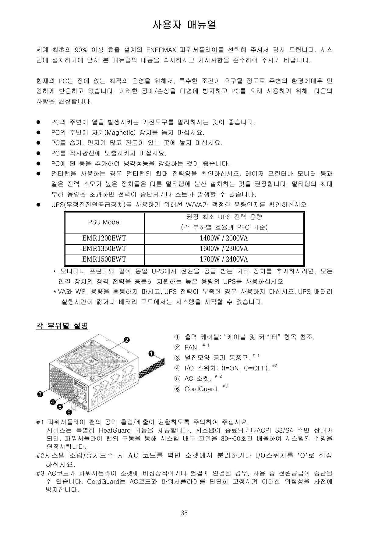 사용자 매뉴얼 세계 최초의 90% 이상 효율 설계의 ENERMAX 파워서플라이를 선택해 주셔서 감사 드립니다. 시스 템에 설치하기에 앞서 본 매뉴얼의 내용을 숙지하시고 지시사항을 준수하여 주시기 바랍니다. 현재의 PC는 장애 없는 최적의 운영을 위해서, 특수한 조건이 요구될 정도로 주변의 환경에매우 민 감하게 반응하고 있습니다. 이러한 장애/손상을 미연에 방지하고 PC를 오래 사용하기 위해, 다음의 사항을 권장합니다.