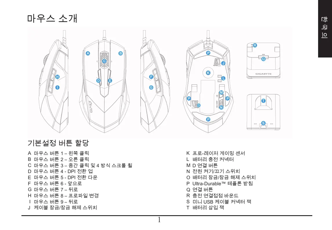마우스 버튼 1 – 왼쪽 클릭 마우스 버튼 2 – 오른 클릭 마우스 버튼 3 – 중간 클릭 및 4 방식 스크롤 휠 마우스 버튼 4 - DPI 전환 업 마우스 버튼 5 - DPI 전환 다운 마우스 버튼 6 - 앞으로 마우스 버튼 7 – 뒤로 마우스 버튼 8 – 프로파일 변경 마우스 버튼 9 – 뒤로 케이블 잠금/잠금 해제 스위치