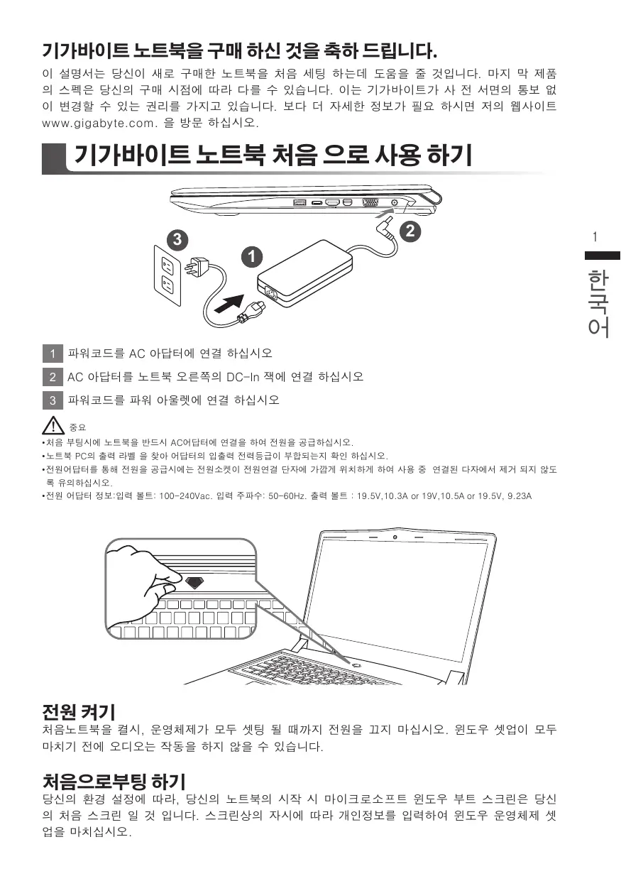 기가바이트 노트북을 구매 하신 것을 축하 드립니다. 이 설명서는 당신이 새로 구매한 노트북을 처음 세팅 하는데 도움을 줄 것입니다. 마지 막 제품 의 스펙은 당신의 구매 시점에 따라 다를 수 있습니다. 이는 기가바이트가 사 전 서면의 통보 없 이 변경할 수 있는 권리를 가지고 있습니다. 보다 더 자세한 정보가 필요 하시면 저의 웹사이트 www.gigabyte.com. 을 방문 하십시오.