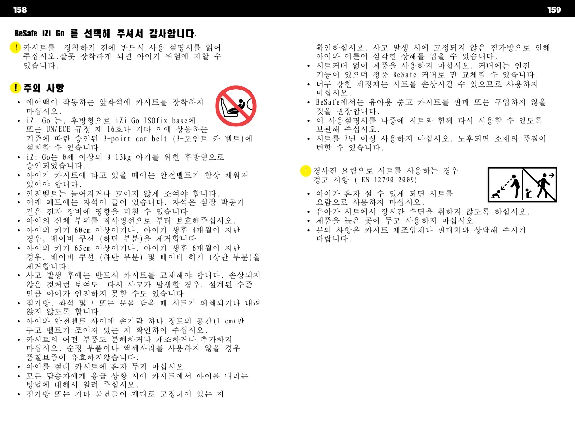 • 에어백이 작동하는 앞좌석에 카시트를 장착하지 마십시오. • iZi Go 는, 후방형으로 iZi Go ISOfix base에, 또는 UN/ECE 규정 제 16호나 기타 이에 상응하는 기준에 따란 승인된 3-point car belt (3-포인트 카 벨트)에 설치할 수 있습니다. • iZi Go는 0세 이상의 0-13kg 아기를 위한 후방형으로 승인되었습니다.. • 아이가 카시트에 타고 있을 때에는 안전벨트가 항상 채워져 있어야 합니다. • 안전벨트는 늘어지거나 꼬이지 않게 조여야 합니다. • 어깨 패드에는 자석이 들어 있습니다. 자석은 심장 박동기 같은 전자 장비에 영향을 미칠 수 있습니다. • 아이의 신체 부위를 직사광선으로 부터 보호해주십시오. • 아이의 키가 60cm 이상이거나, 아이가 생후 4개월이 지난 경우, 베이비 쿠션 (하단 부분)을 제거합니다. • 아이의 키가 65cm 이상이거나, 아이가 생후 6개월이 지난 경우, 베이비 쿠션 (하단 부분) 및 베이비 허거 (상단 부분)을 제거합니다. • 사고 발생 후에는 반드시 카시트를 교체해야 합니다. 손상되지 않은 것처럼 보여도. 다시 사고가 발생할 경우, 설계된 수준 만큼 아이가 안전하지 못할 수도 있습니다. • 짐가방, 좌석 및 / 또는 문을 닫을 때 시트가 폐쇄되거나 내려 앉지 않도록 합니다. • 아이와 안전벨트 사이에 손가락 하나 정도의 공간(1 cm)만 두고 벨트가 조여져 있는 지 확인하여 주십시오. • 카시트의 어떤 부품도 분해하거나 개조하거나 추가하지 마십시오. 순정 부품이나 액세사리를 사용하지 않을 경우 품질보증이 유효하지않습니다. • 아이를 절대 카시트에 혼자 두지 마십시오. • 모든 탑승자에게 응급 상황 시에 카시트에서 아이를 내리는 방법에 대해서 알려 주십시오. • 짐가방 또는 기타 물건들이 제대로 고정되어 있는 지