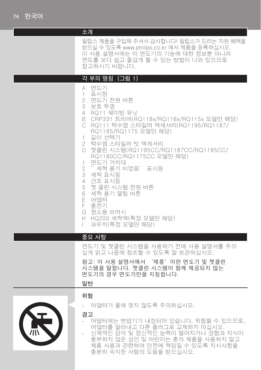 6 Botão de libertação da câmara de limpeza E Transformador F Carregador G Escova de limpeza H Líquido de limpeza HQ200 (apenas em modelos específicos) 5 Botón de encendido/apagado del sistema Jet Clean 6 Botón de liberación de la cámara de limpieza E Adaptador de corriente F Cargador G Cepillo de limpieza H Líquido limpiador HQ200 (solo en modelos específicos) I Funda (sólo en modelos específicos) Importante Antes de usar la afeitadora y el sistema Jet Clean, lea atentamente este manual de usuario y consérvelo por si necesitara consultarlo en el futuro. Nota: En este manual de usuario, el término “aparatos” se refiere a la afeitadora y al sistema Jet Clean. Si la afeitadora no dispone de sistema Jet Clean, se referirá únicamente a la afeitadora. General Peligro -- Asegúrese de que el adaptador no se moje.