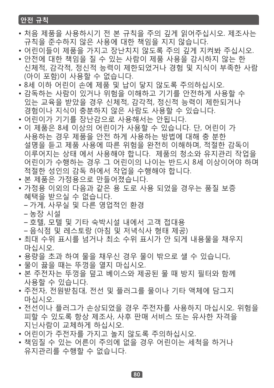• 처음 제품을 사용하시기 전 본 규칙을 주의 깊게 읽어주십시오. 제조사는 규칙을 준수하지 않은 사용에 대한 책임을 지지 않습니다. • 어린이들이 제품을 가지고 장난치지 않도록 주의 깊게 지켜봐 주십시오. • 안전에 대한 책임을 질 수 있는 사람이 제품 사용을 감시하지 않는 한 신체적, 감각적, 정신적 능력이 제한되었거나 경험 및 지식이 부족한 사람 (아이 포함)이 사용할 수 없습니다. • 8세 이하 어린이 손에 제품 및 납이 닿지 않도록 주의하십시오. • 감독하는 사람이 있거나 위험을 이해하고 기기를 안전하게 사용할 수 있는 교육을 받았을 경우 신체적, 감각적, 정신적 능력이 제한되거나 경험이나 지식이 충분하지 않은 사람도 사용할 수 있습니다. • 어린이가 기기를 장난감으로 사용해서는 안됩니다. • 이 제품은 8세 이상의 어린이가 사용할 수 있습니다. 단, 어린이 가 사용하는 경우 제품을 안전 하게 사용하는 방법에 대해 충 분한 설명을 듣고 제품 사용에 따른 위험을 완전히 이해하며, 적절한 감독이 이루어지는 상태 에서 사용해야 합니다. 제품의 청소와 유지관리 작업을 어린이가 수행하는 경우 그 어린이의 나이는 반드시 8세 이상이어야 하며 적절한 성인의 감독 하에서 작업을 수행해야 합니다. • 본 제품은 가정용으로 만들어졌습니다. • 가정용 이외의 다음과 같은 용 도로 사용 되었을 경우는 품질 보증 혜택을 받으실 수 없습니다. ––가게, 사무실 및 다른 영업적인 환경 ––농장 시설 ––호텔, 모텔 및 기타 숙박시설 내에서 고객 접대용 ––음식점 및 레스토랑 (아침 및 저녁식사 형태 제공) • 최대 수위 표시를 넘거나 최소 수위 표시가 안 되게 내용물을 채우지 마십시오. • 용량을 초과 하여 물을 채우신 경우 물이 밖으로 샐 수 있습니다, • 물이 끓을 때는 뚜껑을 열지 마십시오. • 본 주전자는 뚜껑을 덮고 베이스와 제공된 물 때 방지 필터와 함께 사용할 수 있습니다. • 주전자, 전원받침대, 전선 및 플러그를 물이나 기타 액체에 담그지 마십시오. • 전선이나 플러그가 손상되었을 경우 주전자를 사용하지 마십시오. 위험을 피할 수 있도록 항상 제조사, 사후 판매 서비스 또는 유사한 자격을 지닌사람이 교체하게 하십시오. • 어린이가 주전자를 가지고 놀지 않도록 주의하십시오. • 책임질 수 있는 어른이 주의에 없을 경우 어린이는 세척을 하거나 유지관리를 수행할 수 없습니다. 80