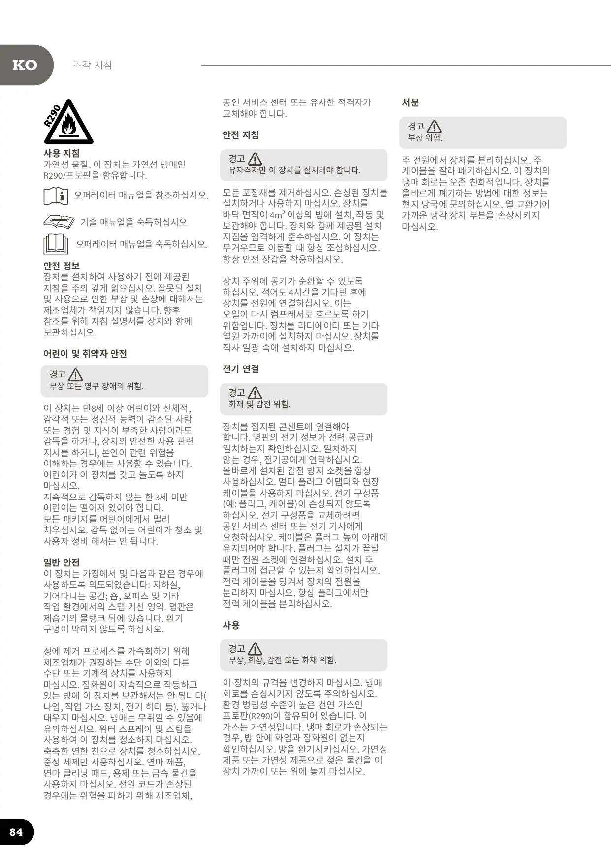 Ne pas utiliser de dispositifs mécaniques ou d'autres moyens pour accélérer le processus de dégivrage, autres que ceux recommandés par le fabricant. L'appareil ne doit pas être entreposé dans une pièce dans laquelle des sources inflammables fonctionnent en permanence (flammes nues, appareil à gaz, radiateur électrique, etc). Ne pas percer ni brûler. Tenir compte du fait que les réfrigérants n'ont pas forcément d'odeur. Ne pas utiliser de pulvérisation d'eau ni de vapeur pour nettoyer l'appareil. Nettoyer l'appareil à l'aide d'un chiffon doux humide. Utiliser uniquement des détergents neutres.