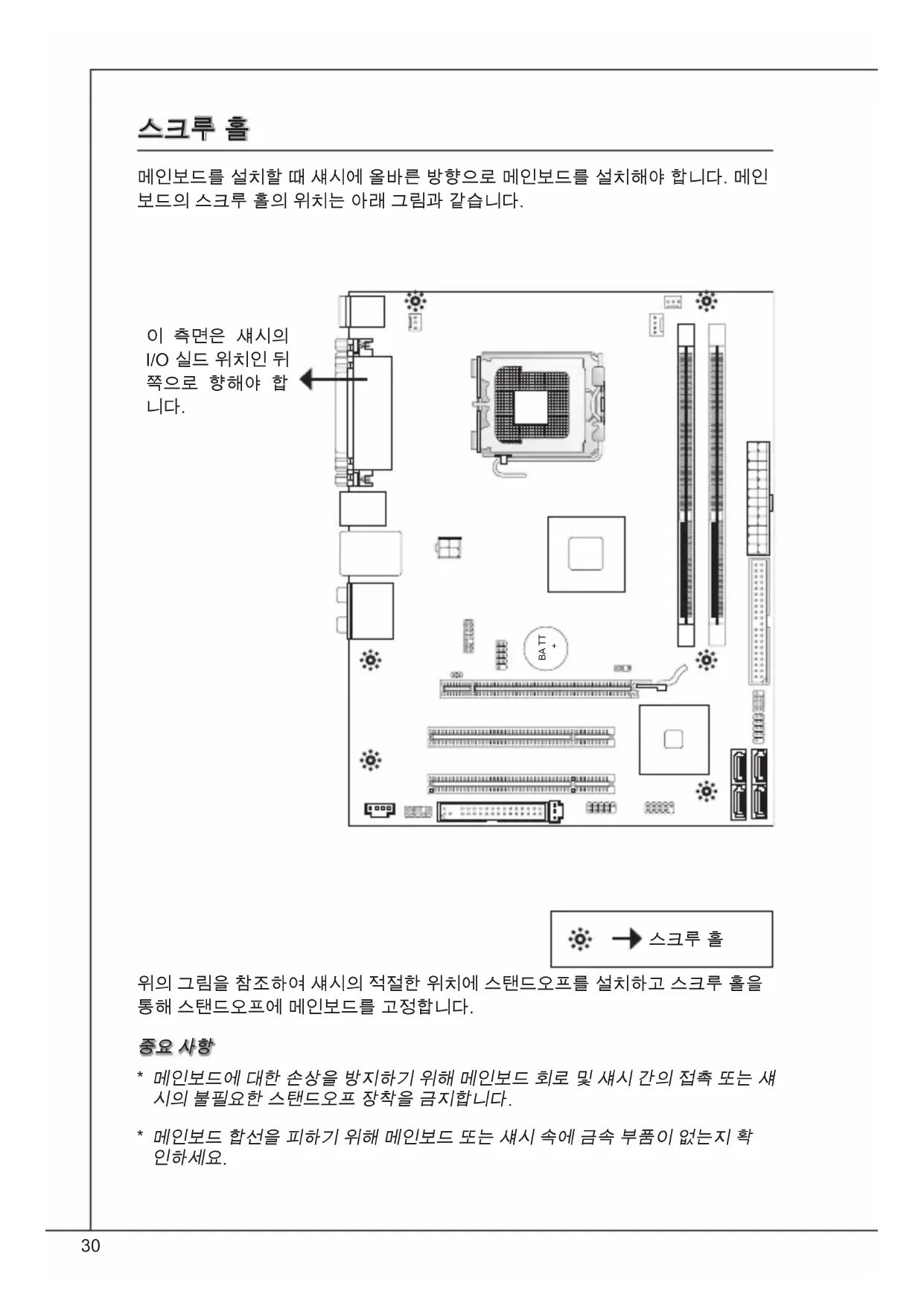 메인보드를 설치할 때 섀시에 올바른 방향으로 메인보드를 설치해야 합니다. 메인