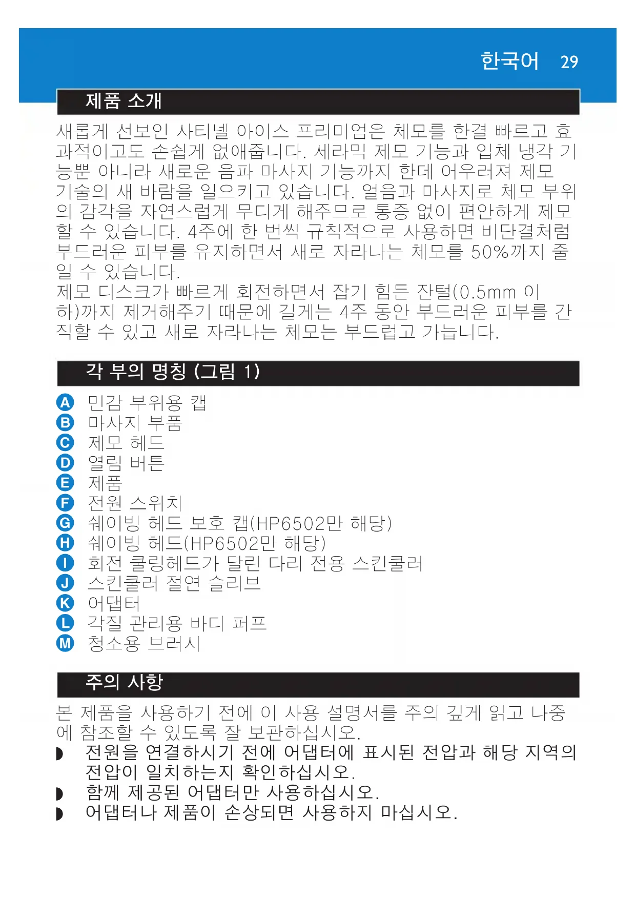 제모 디스크가 빠르게 회전하면서 잡기 힘든 잔털(0.5mm 이 하)까지 제거해주기 때문에 길게는 4주 동안 부드러운 피부를 간 직할 수 있고 새로 자라나는 체모는 부드럽고 가늡니다. 각 부의 명칭 (그림 1) A 민감 부위용 캡 B 마사지 부품 C 제모 헤드 D 열림 버튼 E 제품 F 전원 스위치 G 쉐이빙 헤드 보호 캡(HP6502만 해당) H 쉐이빙 헤드(HP6502만 해당) I 회전 쿨링헤드가 달린 다리 전용 스킨쿨러 J 스킨쿨러 절연 슬리브 K 어댑터 L 각질 관리용 바디 퍼프 M 청소용 브러시