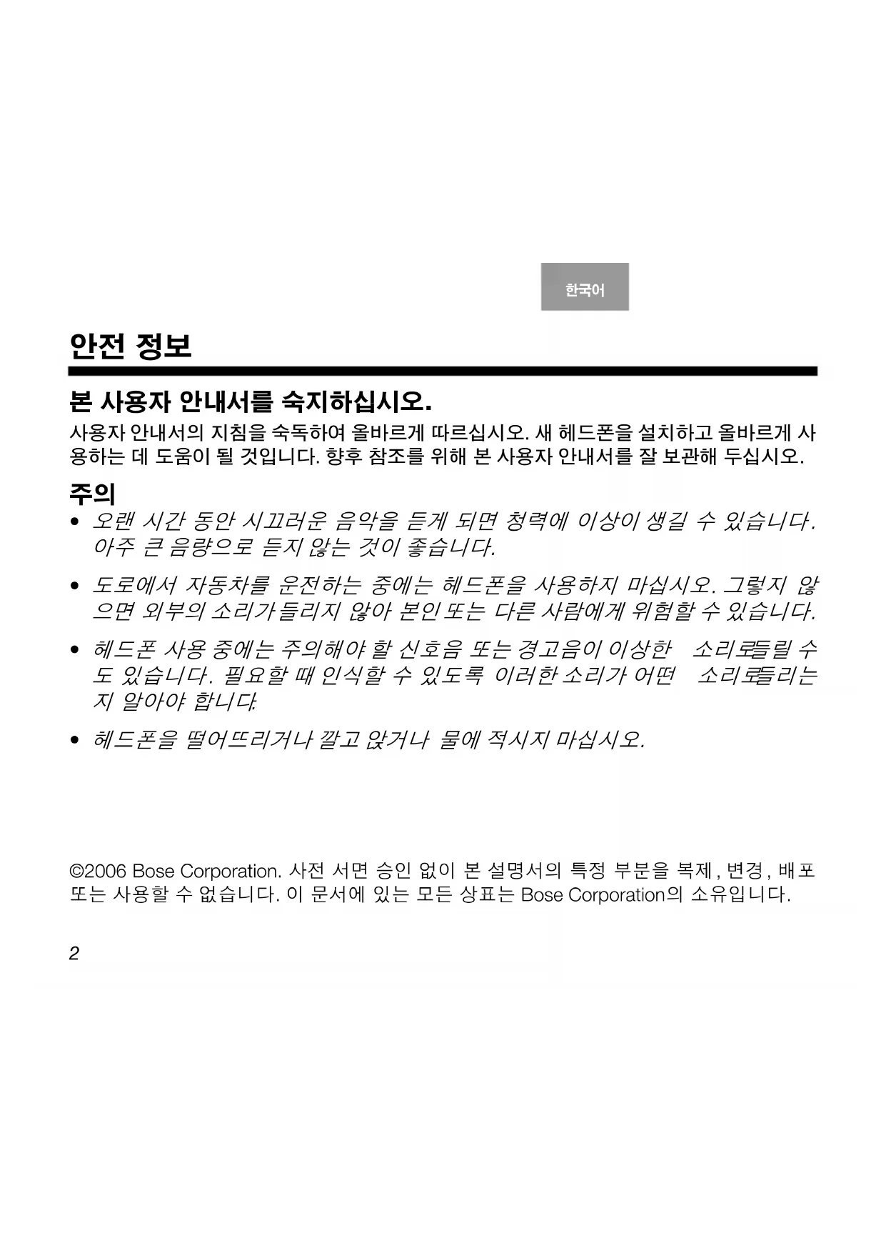 ©2006 Bose Corporation. 사전 서면 승인 없이 본 설명서의 특정 부분을 복제 , 변경 , 배포