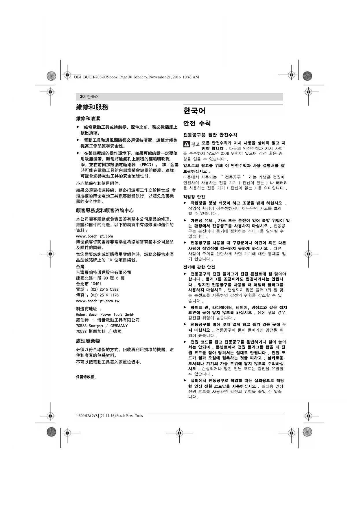 OBJ_BUCH-708-005.book Page 38 Monday, November 21, 2016 10:43 AM | 39 Bosch Power Tools 1 609 92A 2V8 | (21.11.16) 처리 기기와 액세서리 및 포장 등은 친환경적인 방법으로 재활용할 수 있도록 분류하십시오 .전동공구를 가정용 쓰레기로 처리하지 마십시오 !위 사항은 사전 예고 없이 변경될 수도 있습니다 .