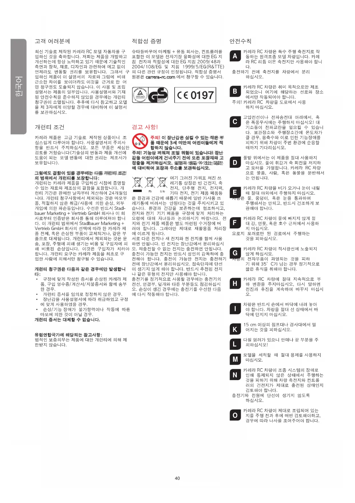 최신 기술로 제작된 카레라 RC 모델 자동차를 구 입하신 것을 축하합니다. 저희는 제품을 개발하고 개선하는데 항상 노력하고 있기 때문에 기술적인 측면과 장착, 재료, 디자인과 관련하여 예고 없이 언제라도 변동할 권리를 보유합니다. 그래서 구 입하신 제품이 이 설명서의 자료와 그림에 비해 근소한 차이를 보이더라도 이것을 근거로 한 어 떤 청구권도 도출되지 않습니다. 이 사용 및 조립 설명서는 제품의 일부입니다. 사용설명서와 기재 된 안전수칙을 준수하지 않았을 경우에는 개런티 청구권이 소멸됩니다. 추후에 다시 참고하고 모델 을 제 3자에게 이양할 경우에 대비하여 이 설명서