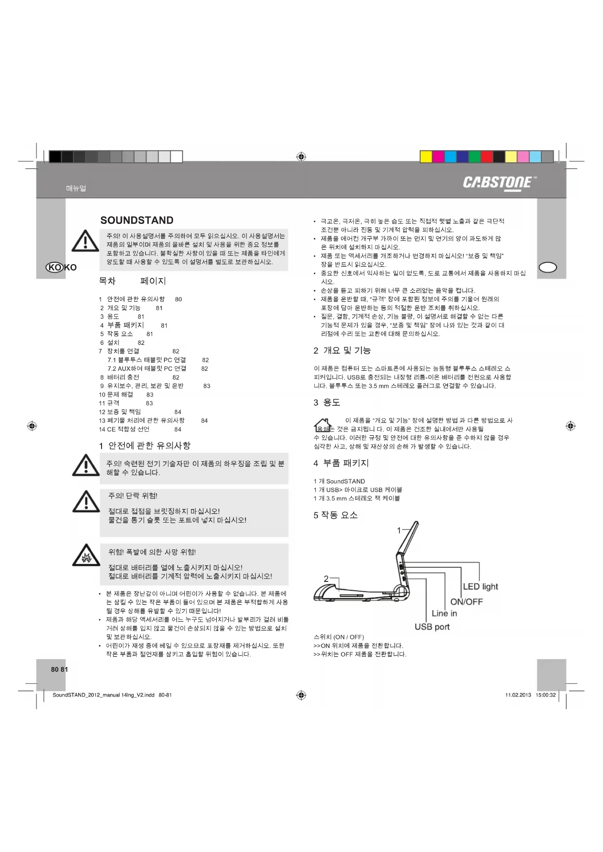 은 이 제품이 EU의 기본 요구사항 및 지침을 준수함을 선언하는 것입니다. 이러한 요구사항 및 지침은 www.cabstone.com 에서 온라인으로 다운로드할 수 있습니다. 모든 브 랜드 및 등록상표는 각 소유주의 재산입니다. SoundSTAND_2012_manual 14lng_V2.indd 84-85 11.02.2013 15:00:32Cabstone™ Pillmannstraße 12 38112 Braunschweig Germany Hotline +49 (0180) 5002524 E-Mail info@cabstone.com Web www.cabstone.com Designed in Germany, made in China. Revision Date 2013-02-11 Version 4 SoundSTAND_2012_manual 14lng_V2.indd 86 11.02.2013 15:00:33