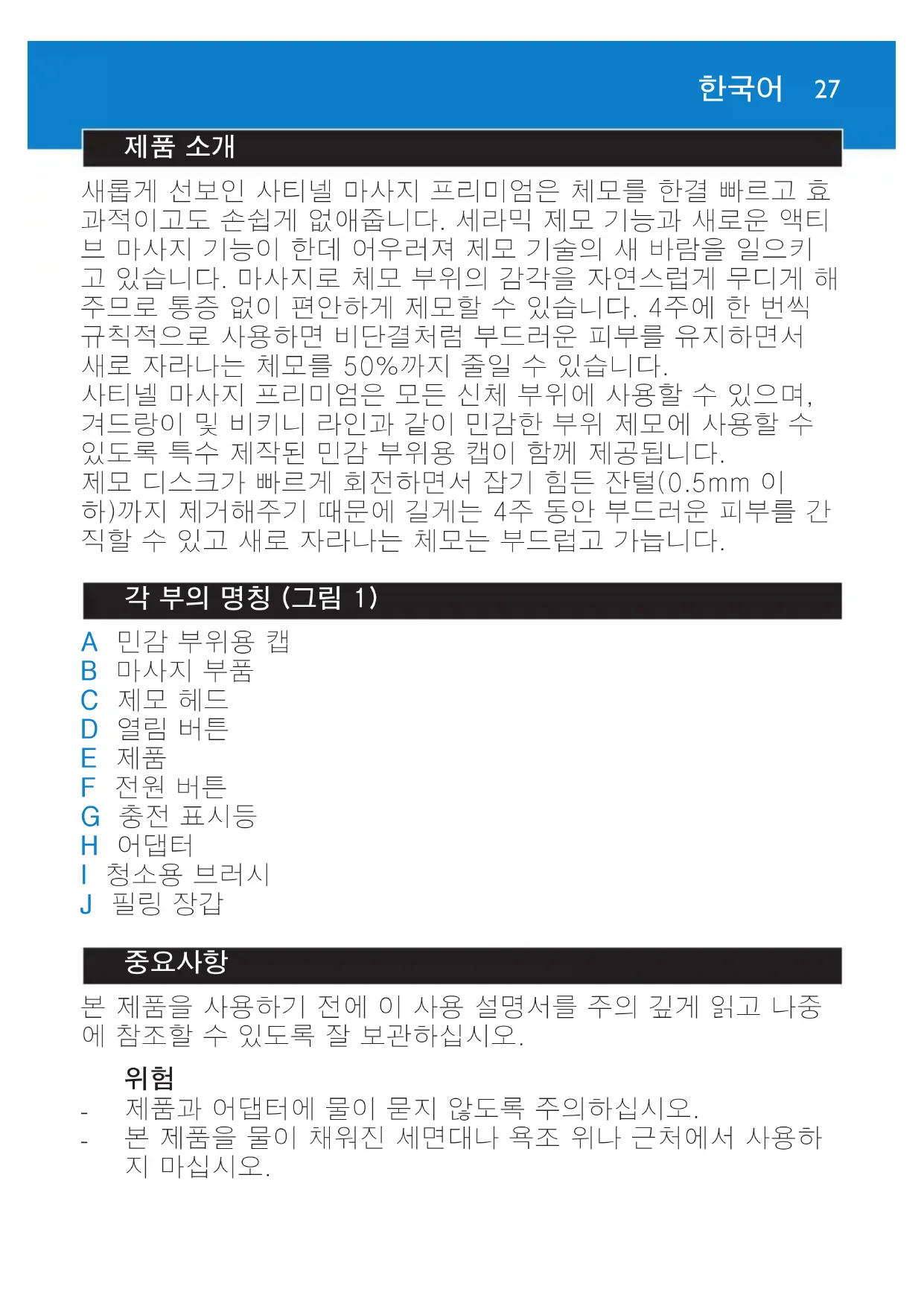 새롭게 선보인 사티넬 마사지 프리미엄은 체모를 한결 빠르고 효 과적이고도 손쉽게 없애줍니다. 세라믹 제모 기능과 새로운 액티 브 마사지 기능이 한데 어우러져 제모 기술의 새 바람을 일으키 고 있습니다. 마사지로 체모 부위의 감각을 자연스럽게 무디게 해 주므로 통증 없이 편안하게 제모할 수 있습니다. 4주에 한 번씩 규칙적으로 사용하면 비단결처럼 부드러운 피부를 유지하면서 새로 자라나는 체모를 50%까지 줄일 수 있습니다. 사티넬 마사지 프리미엄은 모든 신체 부위에 사용할 수 있으며, 겨드랑이 및 비키니 라인과 같이 민감한 부위 제모에 사용할 수 있도록 특수 제작된 민감 부위용 캡이 함께 제공됩니다. 제모 디스크가 빠르게 회전하면서 잡기 힘든 잔털(0.5mm 이 하)까지 제거해주기 때문에 길게는 4주 동안 부드러운 피부를 간 직할 수 있고 새로 자라나는 체모는 부드럽고 가늡니다. 각 부의 명칭 (그림 1) A 민감 부위용 캡 B 마사지 부품 C 제모 헤드 D 열림 버튼 E 제품 F 전원 버튼 G 충전 표시등 H 어댑터 I 청소용 브러시 J 필링 장갑