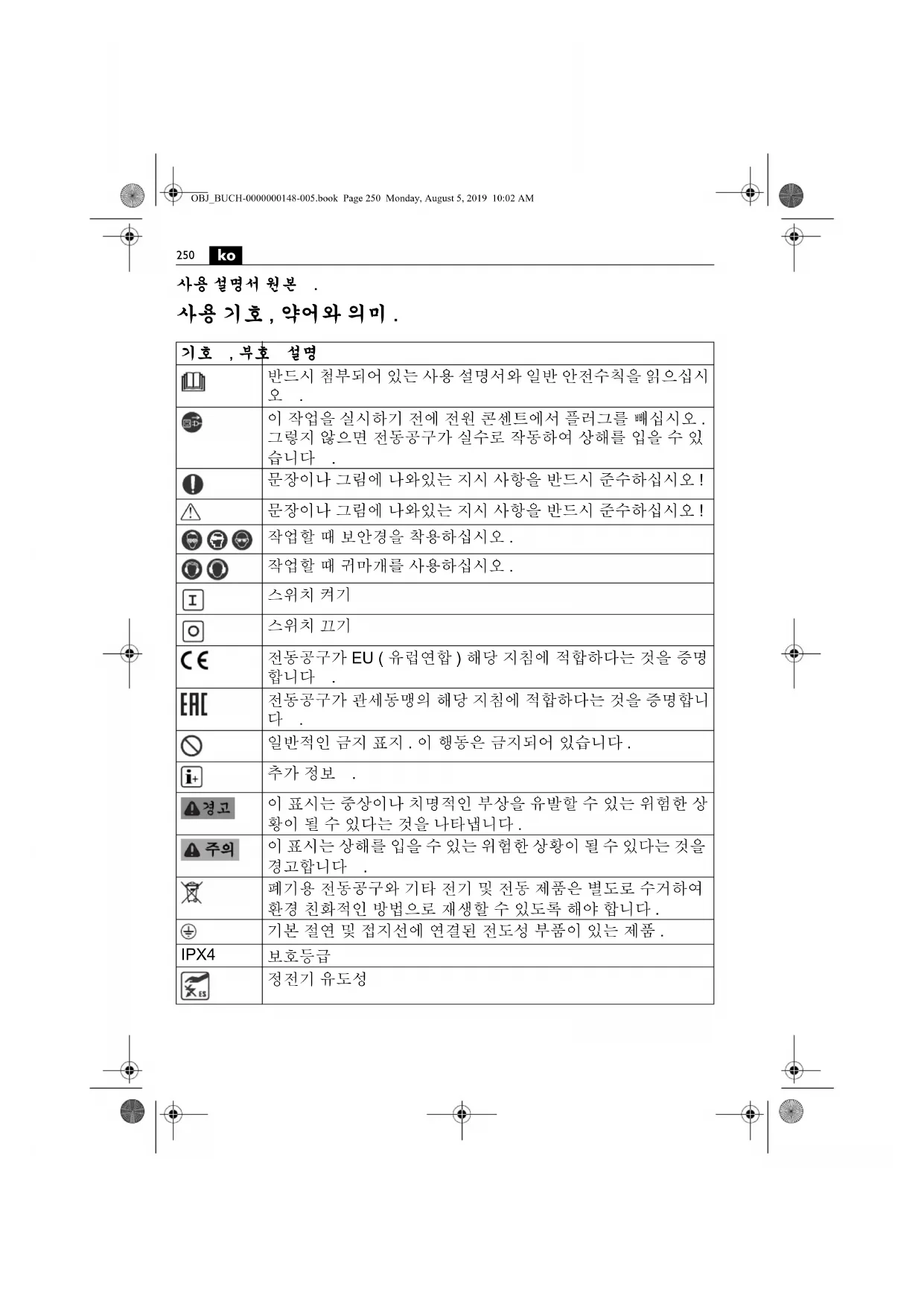 폐기용 전동공구와 기타 전기 및 전동 제품은 별도로 수거하여 환경 친화적인 방법으로 재생할 수 있도록 해야 합니다 . 기본 절연 및 접지선에 연결된 전도성 부품이 있는 제품 . IPX4