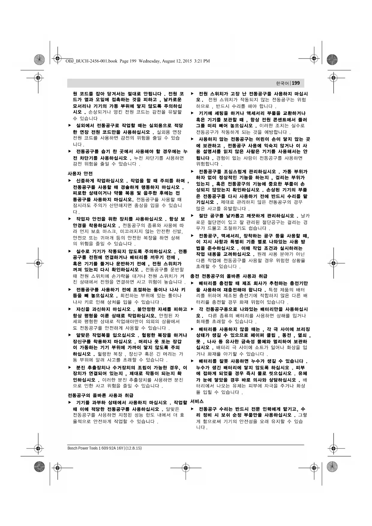 OBJ_BUCH-2456-001.book Page 199 Wednesday, August 12, 2015 3:21 PM200 | 한국어 1 609 92A 16Y | (12.8.15) Bosch Power Tools 드릴 머신과 스크류 드라이버용 안전 수칙