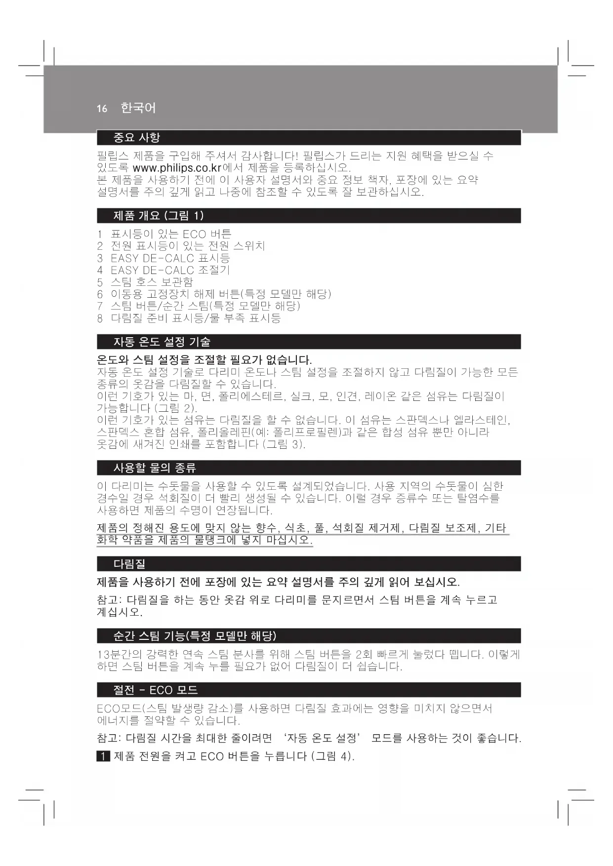 ECO모드(스팀 발생량 감소)를 사용하면 다림질 효과에는 영향을 미치지 않으면서
