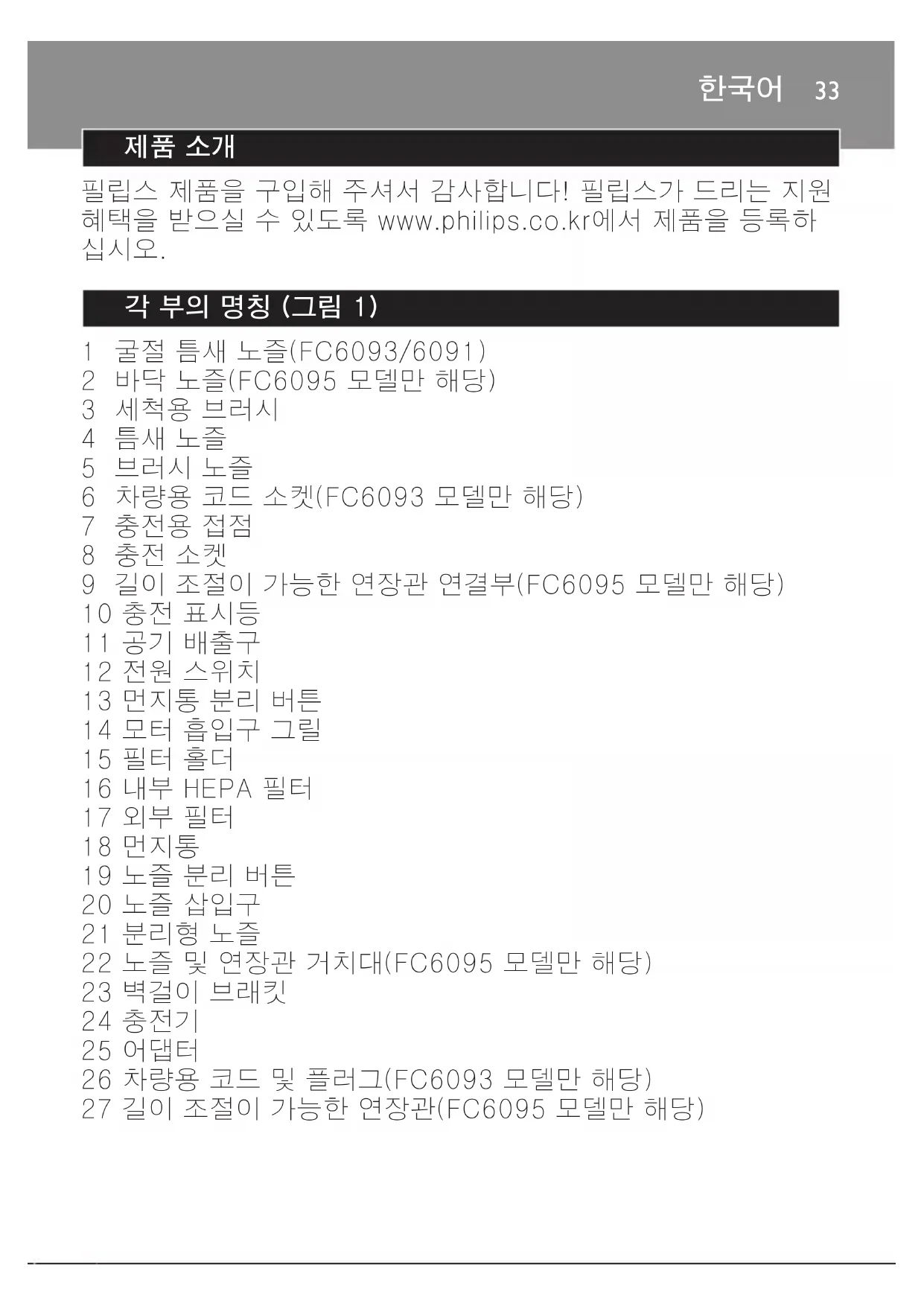각 부의 명칭 (그림 1) 1 굴절 틈새 노즐(FC6093/6091) 2 바닥 노즐(FC6095 모델만 해당) 3 세척용 브러시 4 틈새 노즐 5 브러시 노즐 6 차량용 코드 소켓(FC6093 모델만 해당) 7 충전용 접점 8 충전 소켓 9 길이 조절이 가능한 연장관 연결부(FC6095 모델만 해당) 10 충전 표시등 11 공기 배출구 12 전원 스위치 13 먼지통 분리 버튼 14 모터 흡입구 그릴 15 필터 홀더 16 내부 HEPA 필터 17 외부 필터 18 먼지통 19 노즐 분리 버튼 20 노즐 삽입구 21 분리형 노즐 22 노즐 및 연장관 거치대(FC6095 모델만 해당) 23 벽걸이 브래킷 24 충전기 25 어댑터 26 차량용 코드 및 플러그(FC6093 모델만 해당) 27 길이 조절이 가능한 연장관(FC6095 모델만 해당)