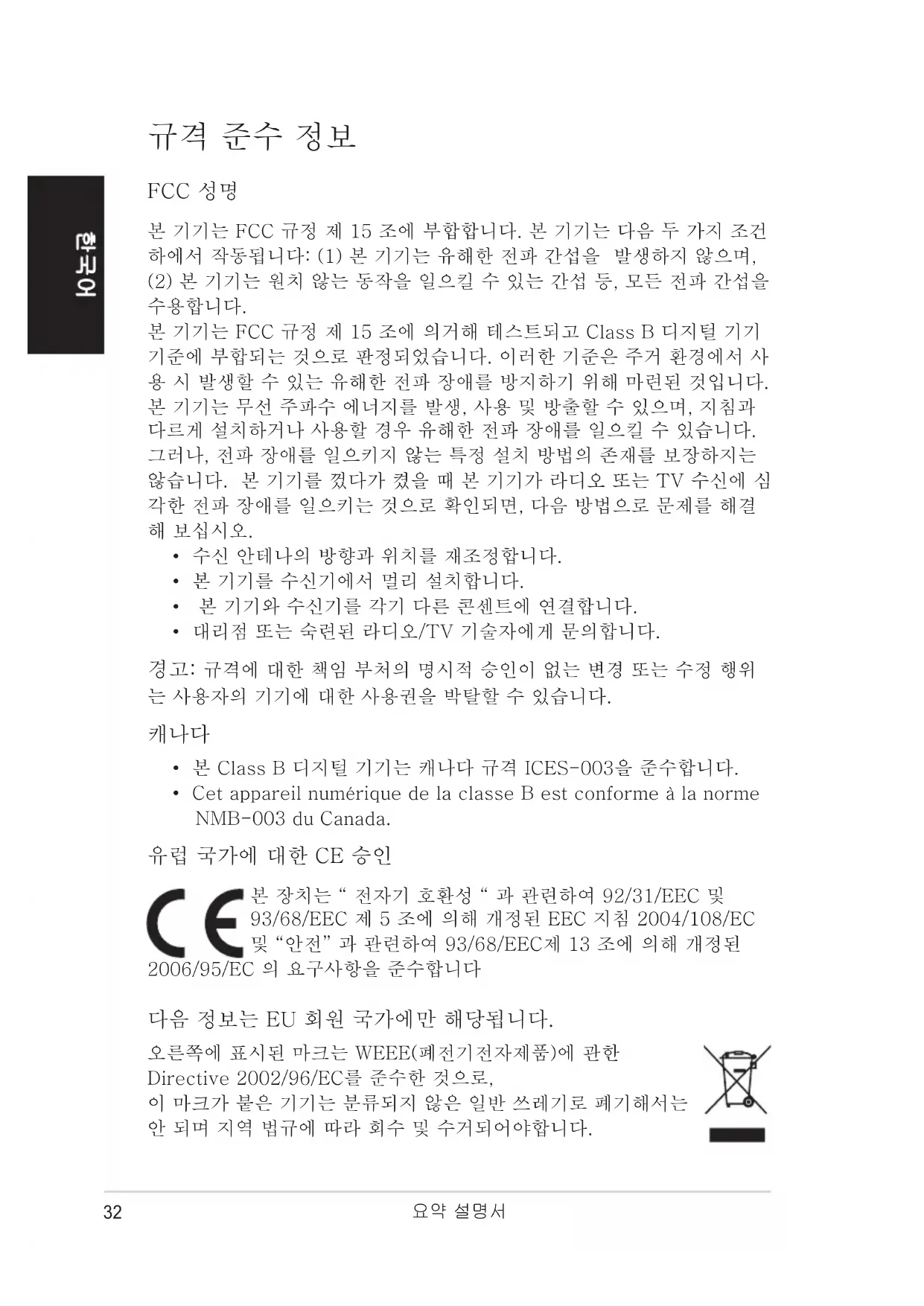 - Cet appareil numérique de la classe B est conforme à la norme NMB-003 du Canada. 유럽 국가에 대한 CE 승인 본 장치는 “ 전자기 호환성 “ 과 관련하여 92/31/EEC 및