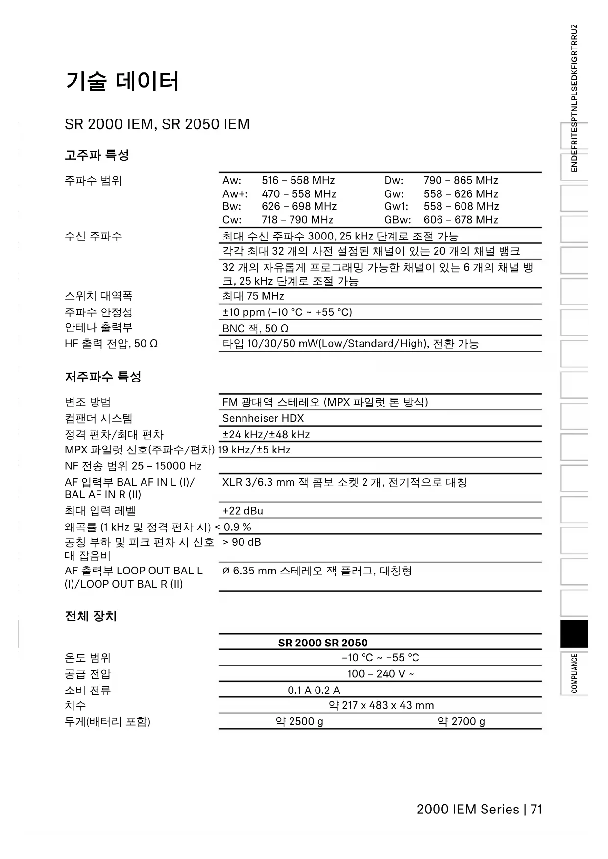 Sennheiser HDX 정격 편차/최대 편차 ±24 kHz/±48 kHz MPX 파일럿 신호(주파수/편차) 19 kHz/±5 kHz NF 전송 범위 25 – 15000 Hz