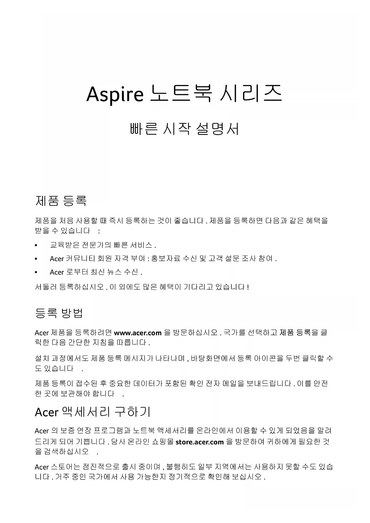 Acer 제품을 등록하려면 www.acer.com 을 방문하십시오 . 국가를 선택하고 제품 등록을 클