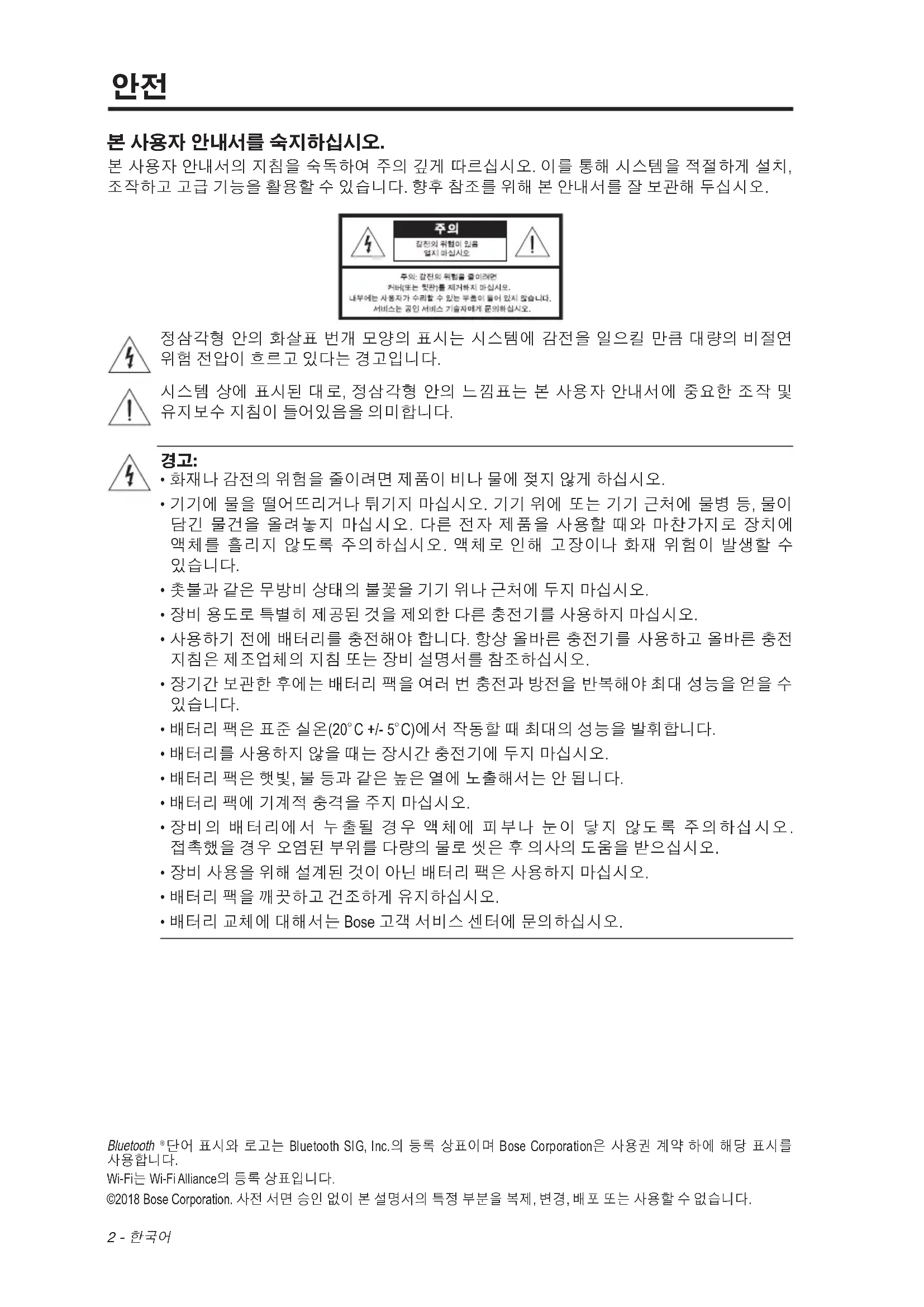 Wi-Fi는 Wi-Fi Alliance의 등록 상표입니다. ©2018 Bose Corporation. 사전 서면 승인 없이 본 설명서의 특정 부분을 복제, 변경, 배포 또는 사용할 수 없습니다.한국어 - 3
