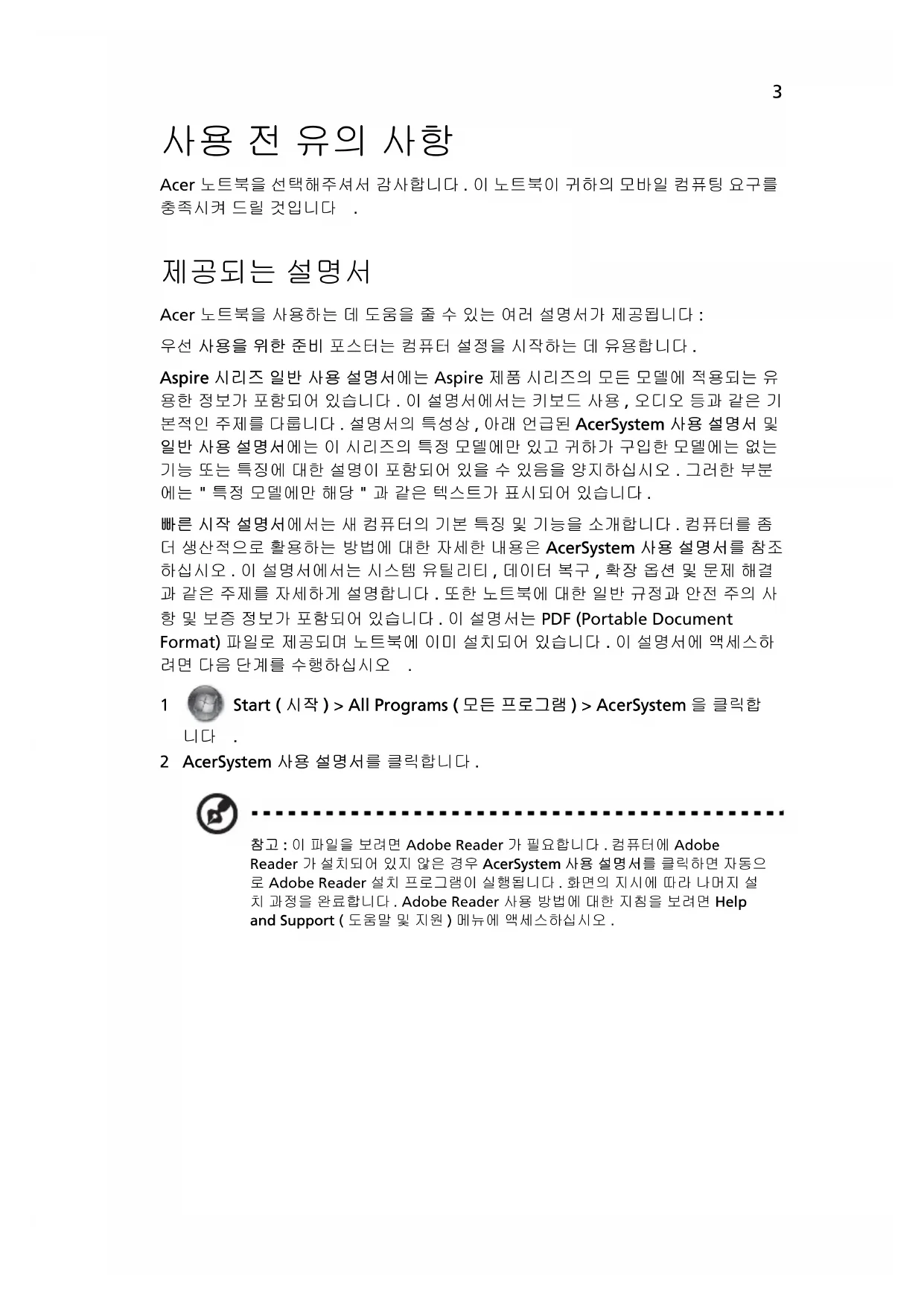 2 AcerSystem 사용 설명서를 클릭합니다 . 참고 : 이 파일을 보려면 Adobe Reader 가 필요합니다 . 컴퓨터에 Adobe Reader 가 설치되어 있지 않은 경우 AcerSystem 사용 설명서를 클릭하면 자동으 로 Adobe Reader 설치 프로그램이 실행됩니다 . 화면의 지시에 따라 나머지 설 치 과정을 완료합니다 . Adobe Reader 사용 방법에 대한 지침을 보려면 Help and Support ( 도움말 및 지원 ) 메뉴에 액세스하십시오 .4