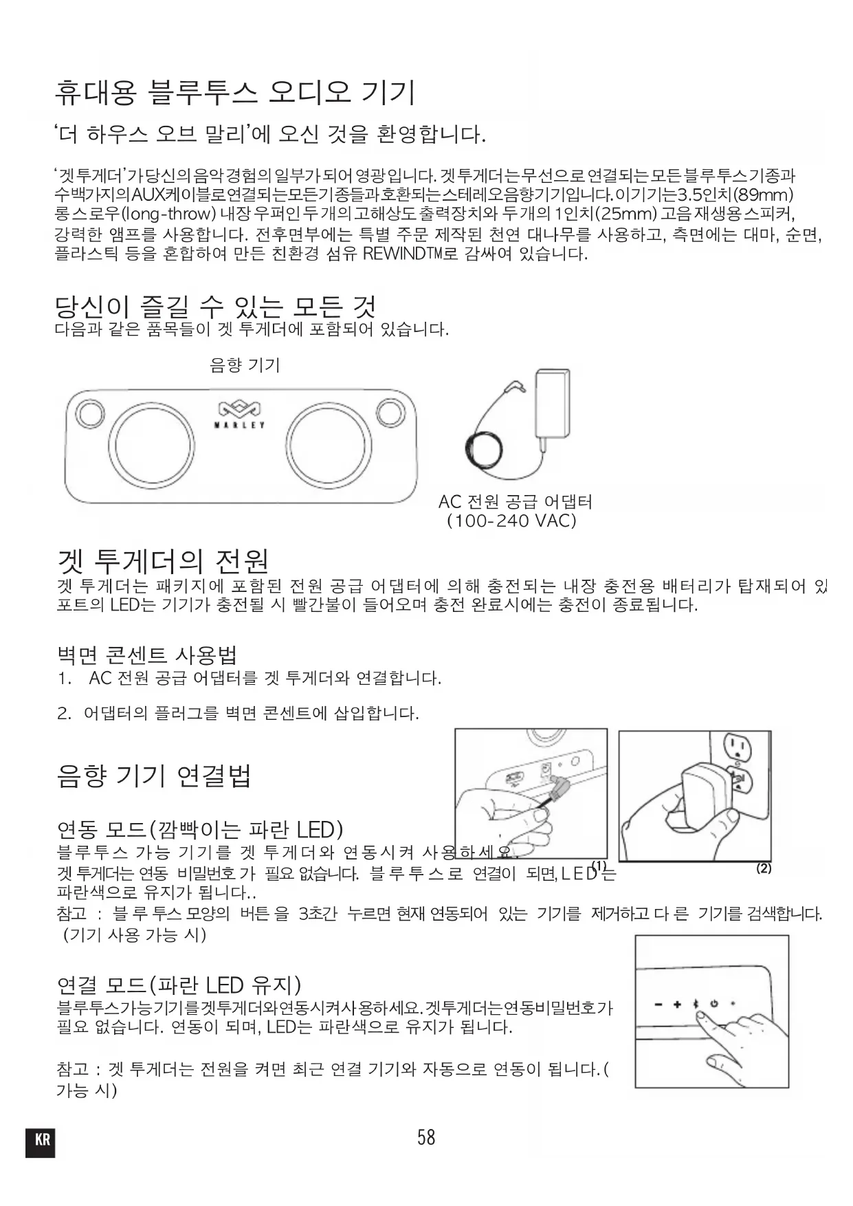 WEEE acıklaması Bu işaret bu urunun AB genelinde diğer ev aklarıyla birlikte almaması gerekğini belirr. Kontrolsuz ağın cevre veya insan sağlığına olası zararları engellemek icin sorumlu bir şekilde geri donuşturulmesini ve malzeme kaynaklarının surdurebilir şekilde yeniden kullanılmasını sağlayın. Kullanılmış aygınızı iade etmek icin luen iade sistemlerini kullanın veya urunu san aldığınız perakende saş noktasıyla goruşun. Kendileri bu urunu cevreye zarar vermeyecek şekilde geri donuşturulmek uzere gerekli yere gonderebilirler. PIL DIREKTIFI Bu sembol, cevreye ve sağlığa karşı zararlı olabilen maddeler icerebileceği icin pillerin ev ağıyla almaması gerekği gosterir. Luen, pilleri belirlen toplama noktalarına an. TR58 휴대용 블루투스 오디오 기기 ‘더 하우스 오브 말리’에 오신 것을 환영합니다. ‘ 겟 투 게 더 ’ 가 당 신 의 음 악 경 험 의 일 부 가 되 어 영 광 입 니 다 . 겟 투 게 더 는 무 선 으 로 연 결 되 는 모 든 블 루 투 스 기 종 과 수 백 가 지 의 A U X 케 이 블 로 연 결 되 는 모 든 기 종 들 과 호 환 되 는 스 테 레 오 음 향 기 기 입 니 다 . 이 기 기 는 3 . 5 인 치 ( 8 9 m m ) 롱 스 로 우 ( l o n g - t h r o w ) 내 장 우 퍼 인 두 개 의 고 해 상 도 출 력 장 치 와 두 개 의 1 인 치( 2 5 m m ) 고 음 재 생 용 스 피 커 , 강력한 앰프를 사용합니다. 전후면부에는 특별 주문 제작된 천연 대나무를 사용하고, 측면에는 대마, 순면, 재생 플라스틱 등을 혼합하여 만든 친환경 섬유 REWIND™로 감싸여 있습니다. 당신이 즐길 수 있는 모든 것 다음과 같은 품목들이 겟 투게더에 포함되어 있습니다.