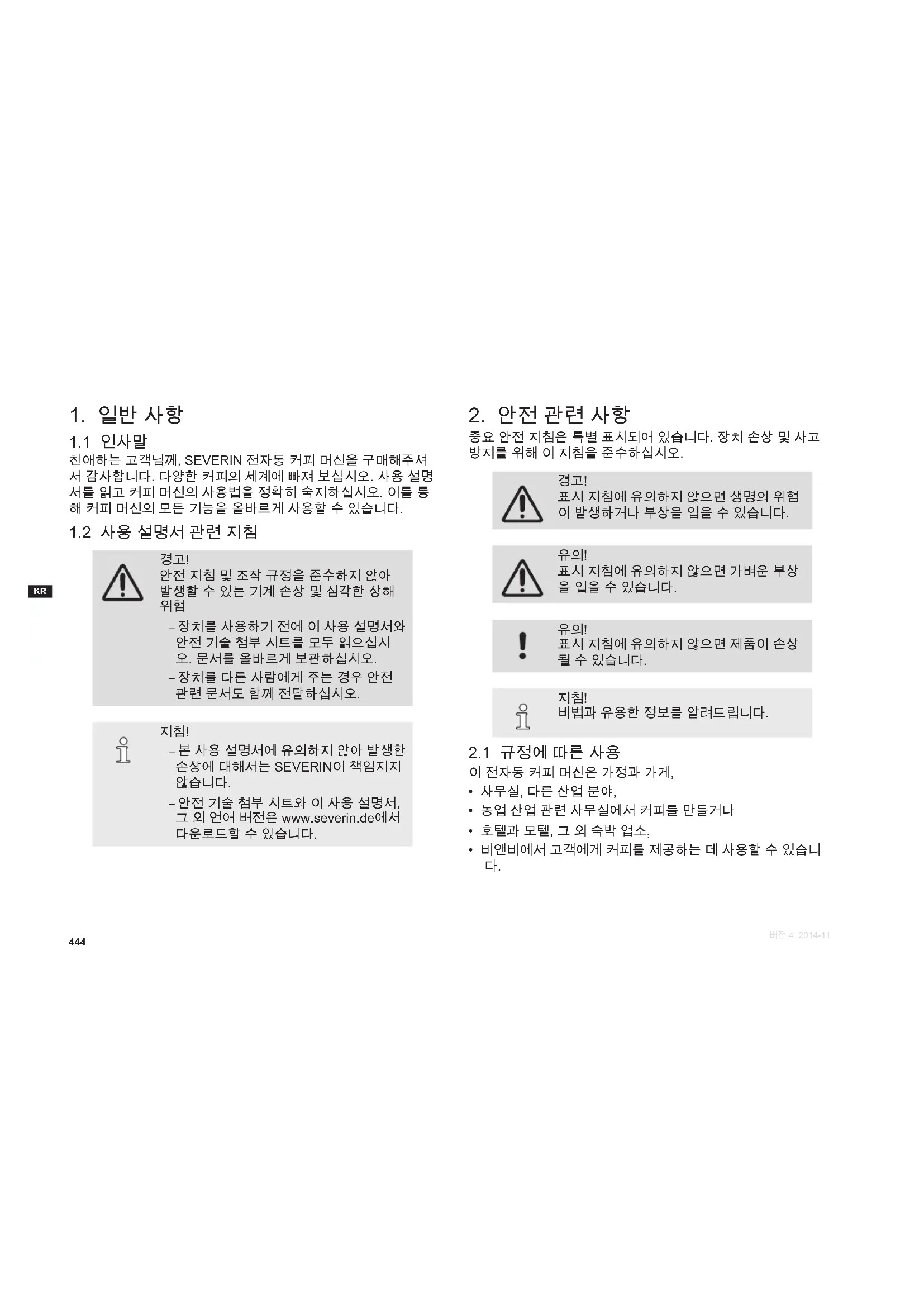 친애하는 고객님께, SEVERIN 전자동 커피 머신을 구매해주셔 서 감사합니다. 다양한 커피의 세계에 빠져 보십시오. 사용 설명 서를 읽고 커피 머신의 사용법을 정확히 숙지하십시오. 이를 통 해 커피 머신의 모든 기능을 올바르게 사용할 수 있습니다.