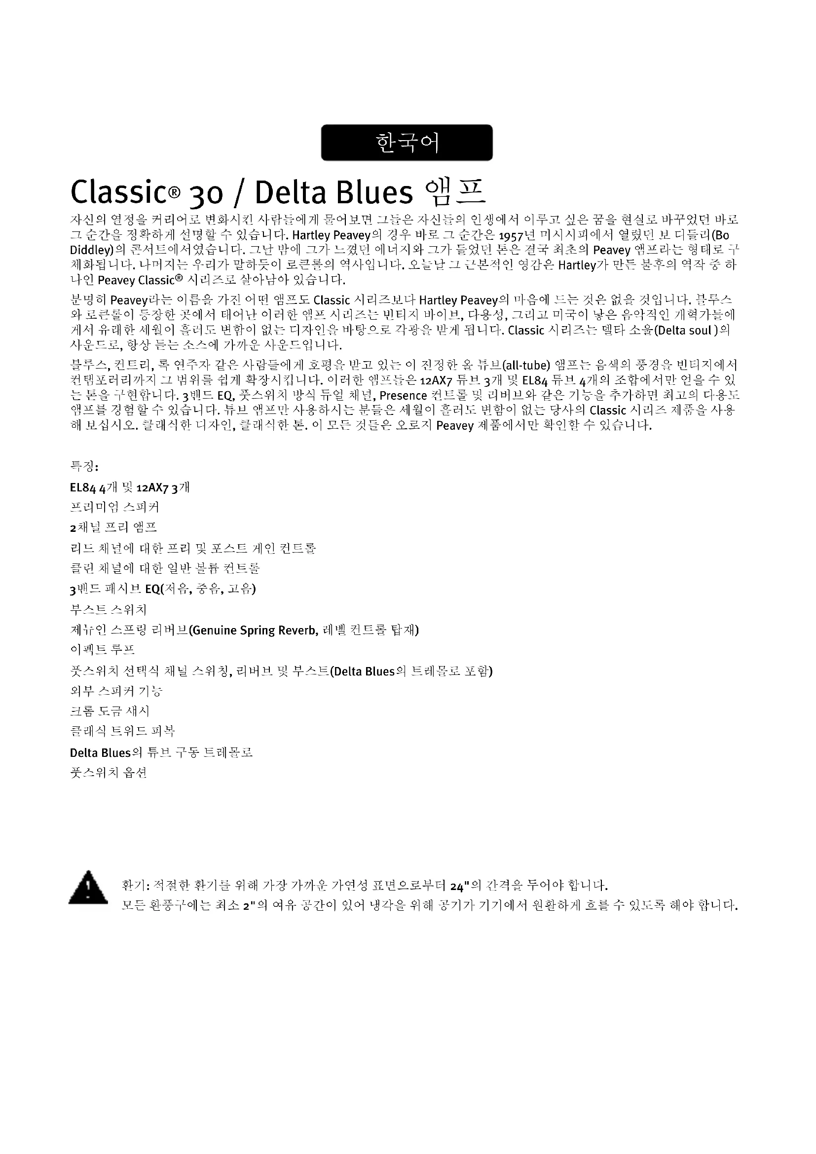 시리즈로 살아남아 있습니다. 분명히 Peavey라는 이름을 가진 어떤 앰프도 Classic 시리즈보다 Hartley Peavey의 마음에 드는 것은 없을 것입니다. 블루스 와 로큰롤이 등장한 곳에서 태어난 이러한 앰프 시리즈는 빈티지 바이브, 다용성, 그리고 미국이 낳은 음악적인 개혁가들에 게서 유래한 세월이 흘러도 변함이 없는 디자인을 바탕으로 각광을 받게 됩니다. Classic 시리즈는 델타 소울(Delta soul )의 사운드로, 항상 듣는 소스에 가까운 사운드입니다. 블루스, 컨트리, 록 연주자 같은 사람들에게 호평을 받고 있는 이 진정한 올 튜브(all-tube) 앰프는 음색의 풍경을 빈티지에서 컨탬포러리까지 그 범위를 쉽게 확장시킵니다. 이러한 앰프들은 12AX7 튜브 3개 및 EL84 튜브 4개의 조합에서만 얻을 수 있 는 톤을 구현합니다. 3밴드 EQ, 풋스위치 방식 듀얼 채널, Presence 컨트롤 및 리버브와 같은 기능을 추가하면 최고의 다용도 앰프를 경험할 수 있습니다. 튜브 앰프만 사용하시는 분들은 세월이 흘러도 변함이 없는 당사의 Classic 시리즈 제품을 사용 해 보십시오. 클래식한 디자인, 클래식한 톤. 이 모든 것들은 오로지 Peavey 제품에서만 확인할 수 있습니다.