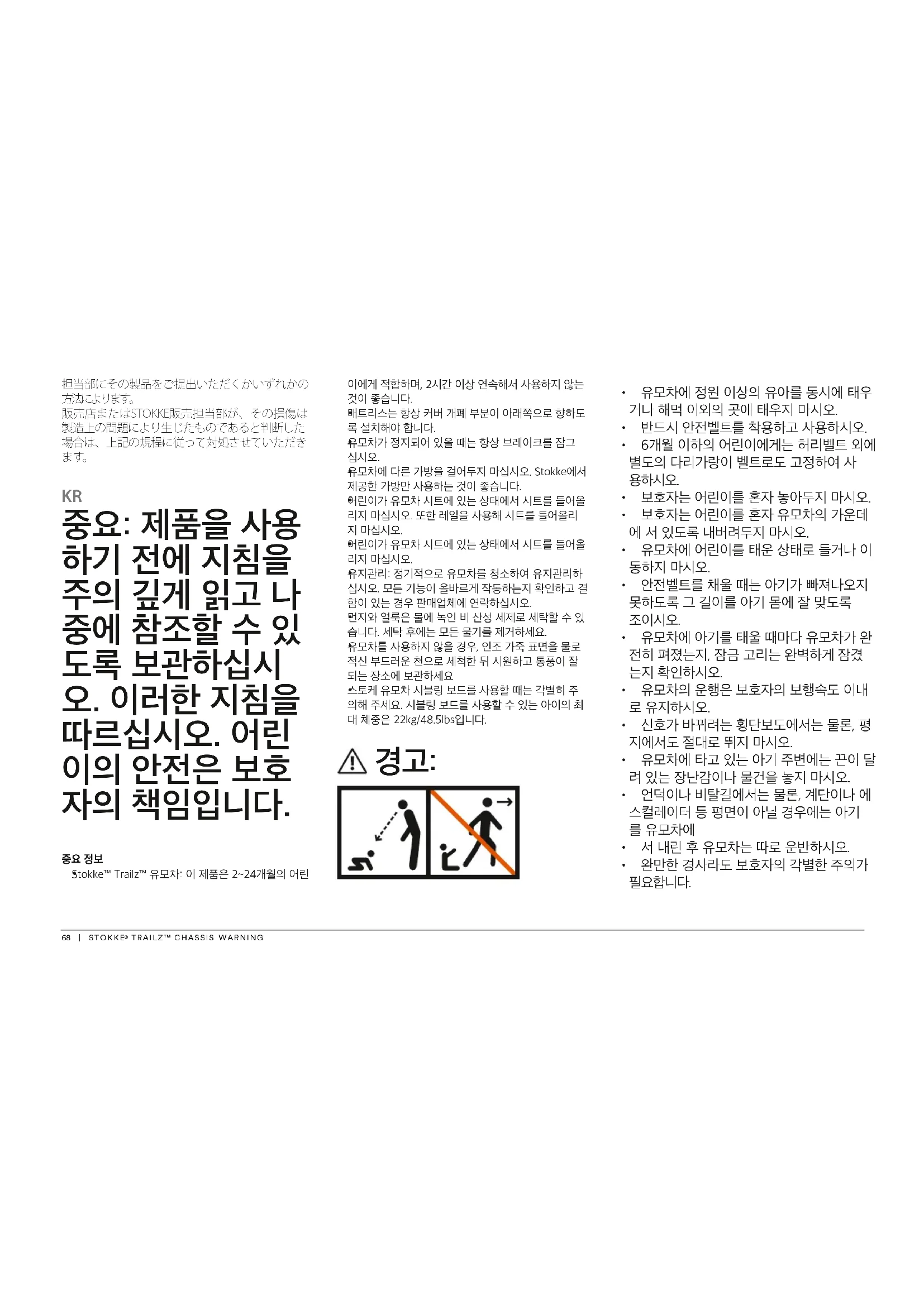 Stokke™ Trailz™ 유모차: 이 제품은 2~24개월의 어린이에게 적합하며, 2시간 이상 연속해서 사용하지 않는 것이 좋습니다. 매트리스는 항상 커버 개폐 부분이 아래쪽으로 향하도록 설치해야 합니다. 유모차가 정지되어 있을 때는 항상 브레이크를 잠그
