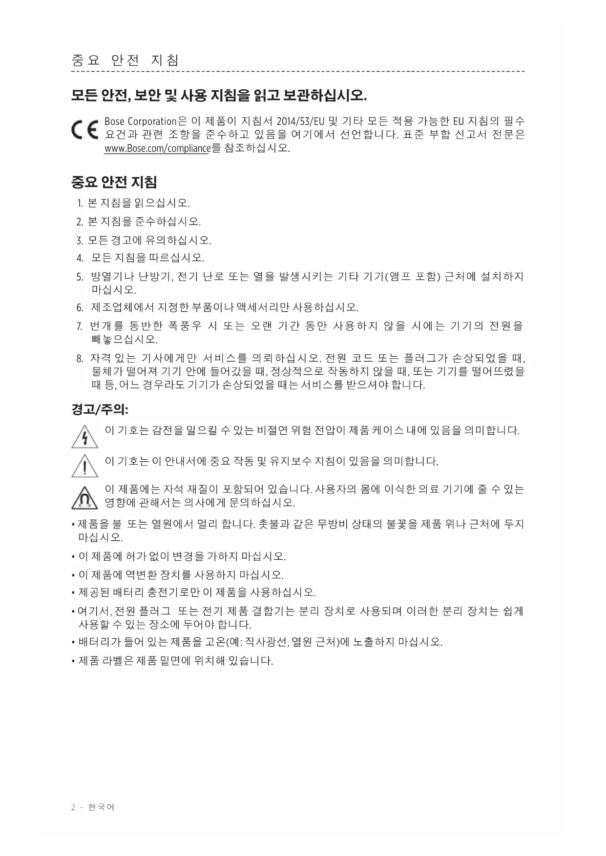 모든 안전, 보안 및 사용 지침을 읽고 보관하십시오. Bose Corporation은 이 제품이 지침서 2014/53/EU 및 기타 모든 적용 가능한 EU 지침의 필수 요건과 관련 조항을 준수하고 있음을 여기에서 선언합니다. 표준 부합 신고서 전문은 www.Bose.com/compliance를 참조하십시오.