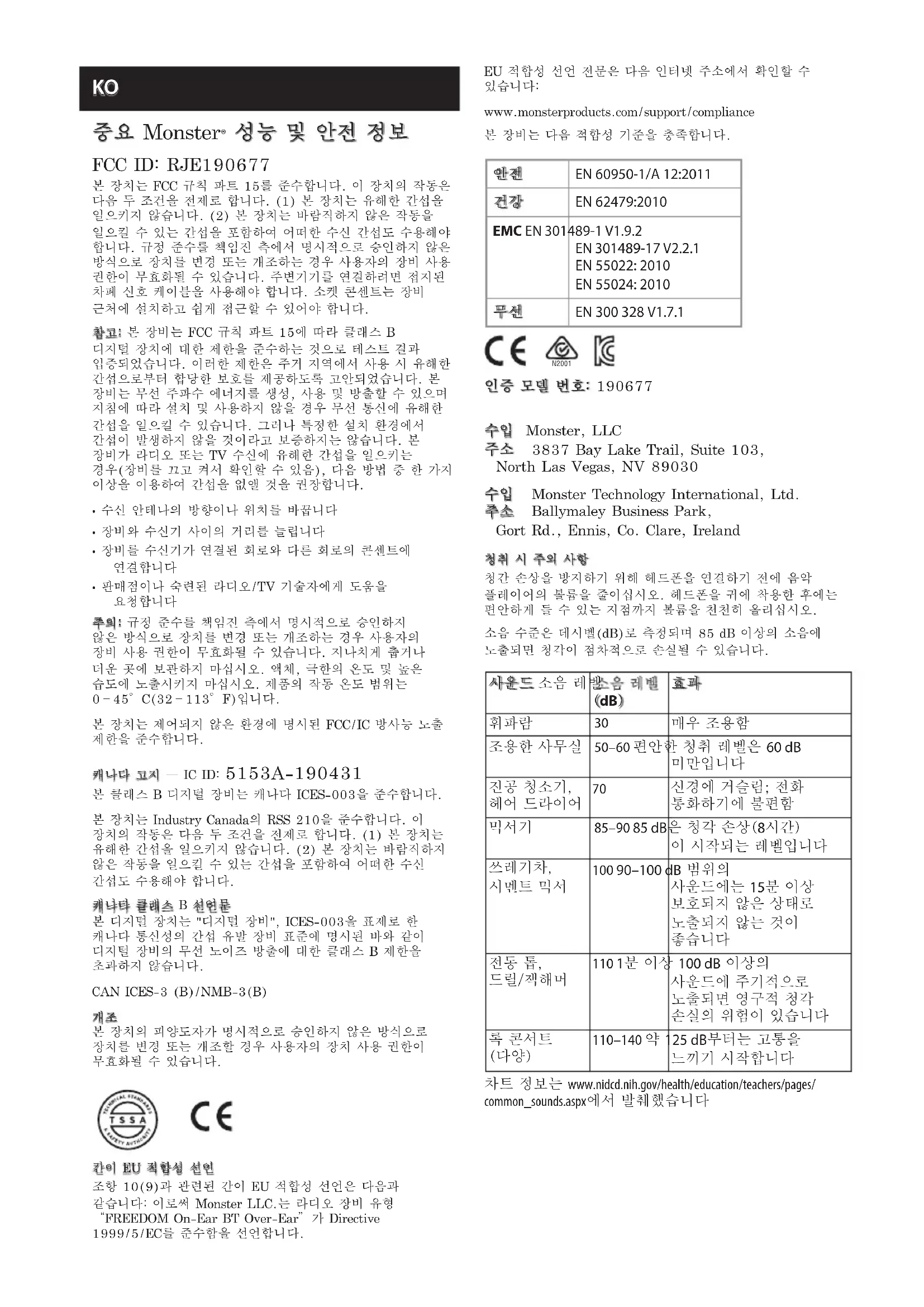 www.monsterproducts.com/support/compliance 본 장비는 다음 적합성 기준을 충족합니다.