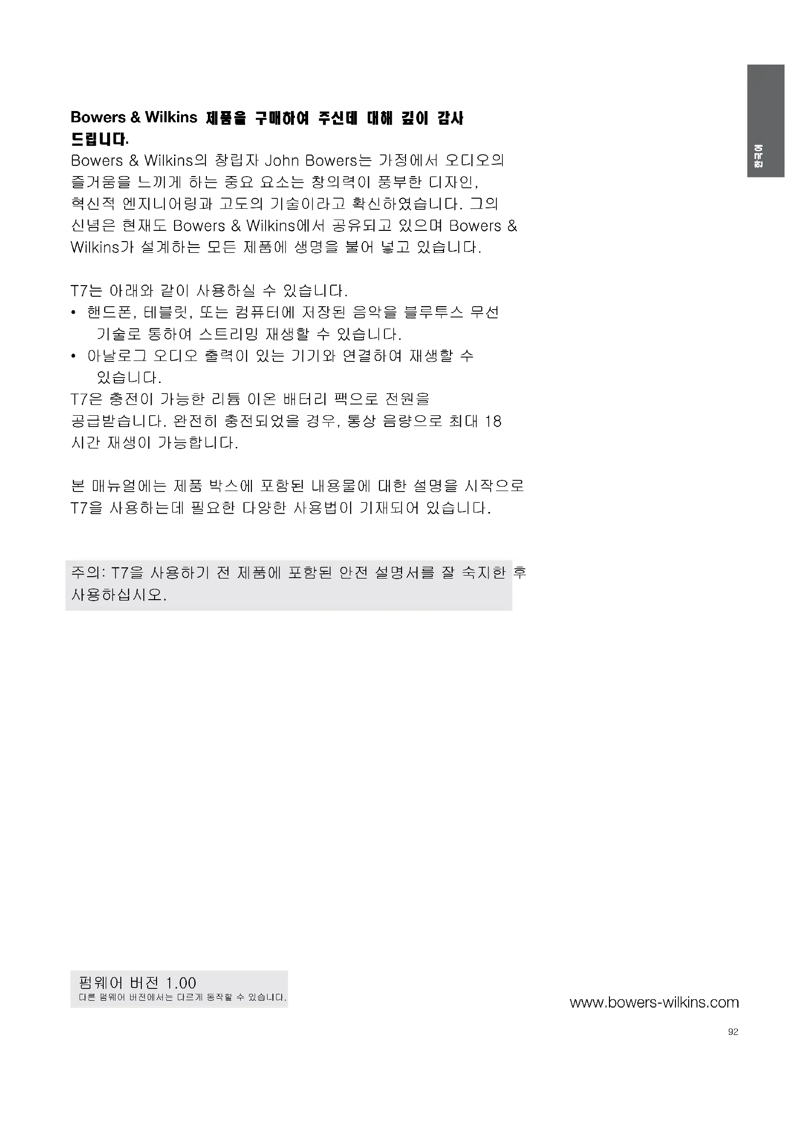 www.bowers-wilkins.com Bowers & Wilkins 제품을 구매하여 주신데 대해 깊이 감사