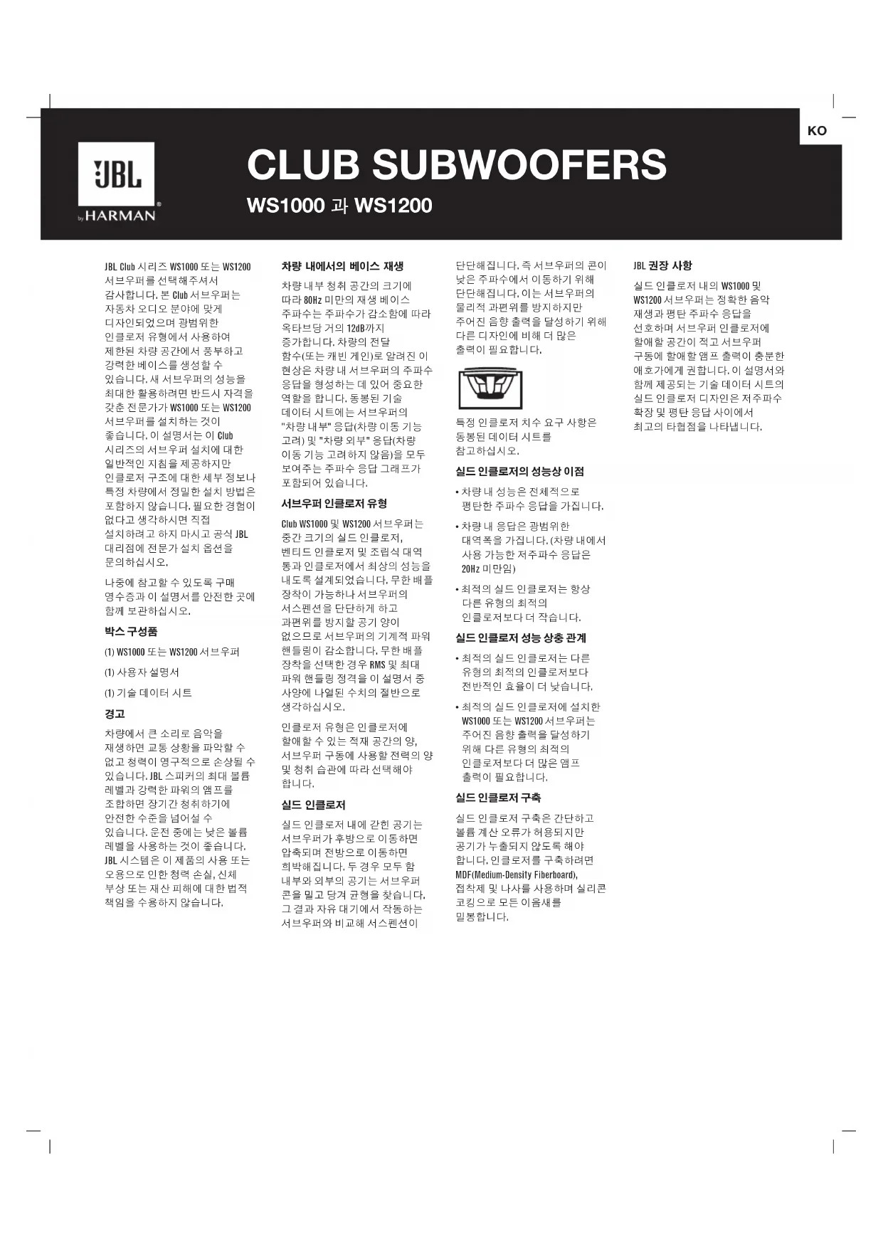 JBL Club 시리즈 WS1000 또는 WS1200 서브우퍼를 선택해주셔서 감사합니다. 본 Club 서브우퍼는 자동차 오디오 분야에 맞게 디자인되었으며 광범위한 인클로저 유형에서 사용하여 제한된 차량 공간에서 풍부하고 강력한 베이스를 생성할 수 있습니다. 새 서브우퍼의 성능을 최대한 활용하려면 반드시 자격을 갖춘 전문가가 WS1000 또는 WS1200 서브우퍼를 설치하는 것이 좋습니다. 이 설명서는 이 Club 시리즈의 서브우퍼 설치에 대한 일반적인 지침을 제공하지만 인클로저 구조에 대한 세부 정보나 특정 차량에서 정밀한 설치 방법은 포함하지 않습니다. 필요한 경험이 없다고 생각하시면 직접 설치하려고 하지 마시고 공식 JBL 대리점에 전문가 설치 옵션을