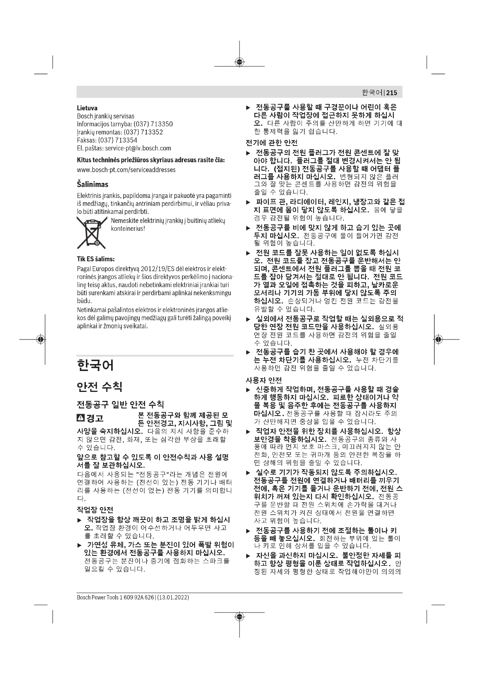 오직 EU 국가에만 해당: 전기장치 및 전자장치 노후기기에 관한 유럽 가이드 라인 2012/19/EU 및 국가별 해당 법에 따라 더 이 상 사용 불가능한 진공청소기는 별도로 수거하여 환 경보호 규정에 따라 재활용해야 합니다. 규정에 맞춰 폐기하지 않을 경우 전기장치 및 전자 장치 노후기기에 남아 있을 수 있는 위험 물질로 인 해 환경 및 인체에 유해한 영향을 미칠 수 있습니다. Bosch Power Tools 1 609 92A 626 | (13.01.2022)222 | يبرع