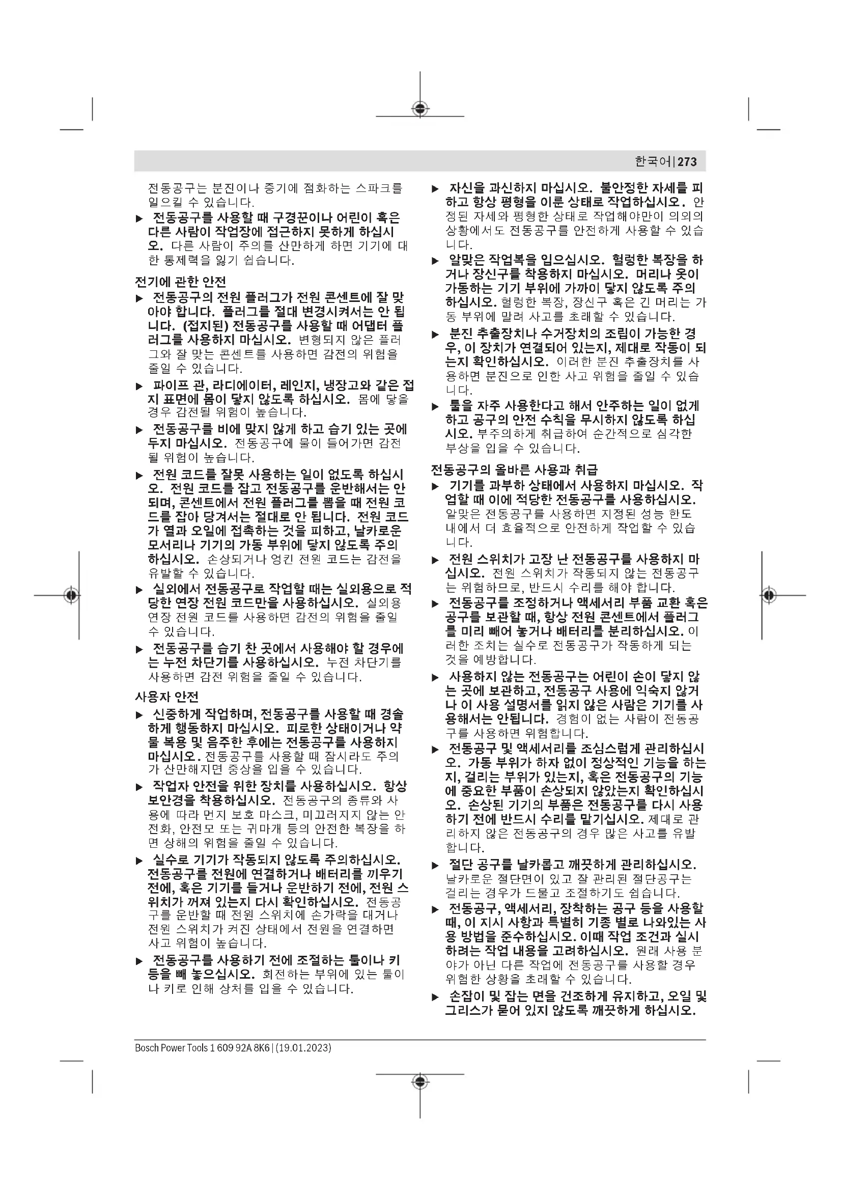 u 작업장을 항상 깨끗이 하고 조명을 밝게 하십시 오. 작업장 환경이 어수선하거나 어두우면 사고 를 초래할 수 있습니다. u 가연성 유체, 가스 또는 분진이 있어 폭발 위험이 있는 환경에서 전동공구를 사용하지 마십시오. 1 609 92A 8K6 | (19.01.2023) Bosch Power Tools한국어 | 273 전동공구는 분진이나 증기에 점화하는 스파크를 일으킬 수 있습니다. u 전동공구를 사용할 때 구경꾼이나 어린이 혹은 다른 사람이 작업장에 접근하지 못하게 하십시 오. 다른 사람이 주의를 산만하게 하면 기기에 대 한 통제력을 잃기 쉽습니다.
