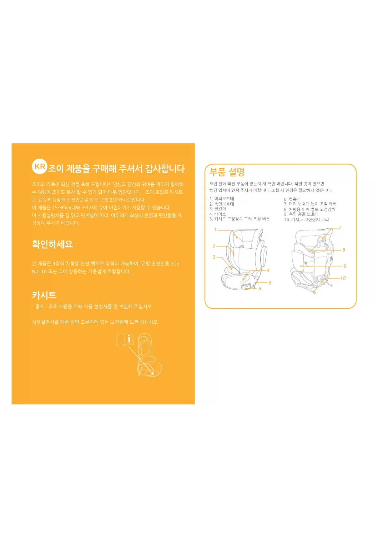 조립 전에 빠진 부품이 없는지 재 확인 바랍니다. 빠진 것이 있으면 해당 업체에 연락 주시기 바랍니다. 조립 시 연장은 필요하지 않습니다. 조이 제품을 구매해 주셔서 감사합니다 조이의 가족이 되신 것을 축하 드립니다! 당신과 당신의 귀여운 아이가 함께하 는 여행에 조이도 동참 할 수 있게 되어 매우 영광입니다. . 조이 트릴로 카시트 는 고품격 품질과 안전인증을 받은 그룹 2/3 카시트입니다. 이 제품은 15-36kg(대략 3-12세) 유아 어린이까지 사용할 수 있습니다. 이 사용설명서를 잘 읽고 단계별에 따라 아이에게 최상의 안전과 편안함을 제 공하여 주시기 바랍니다.